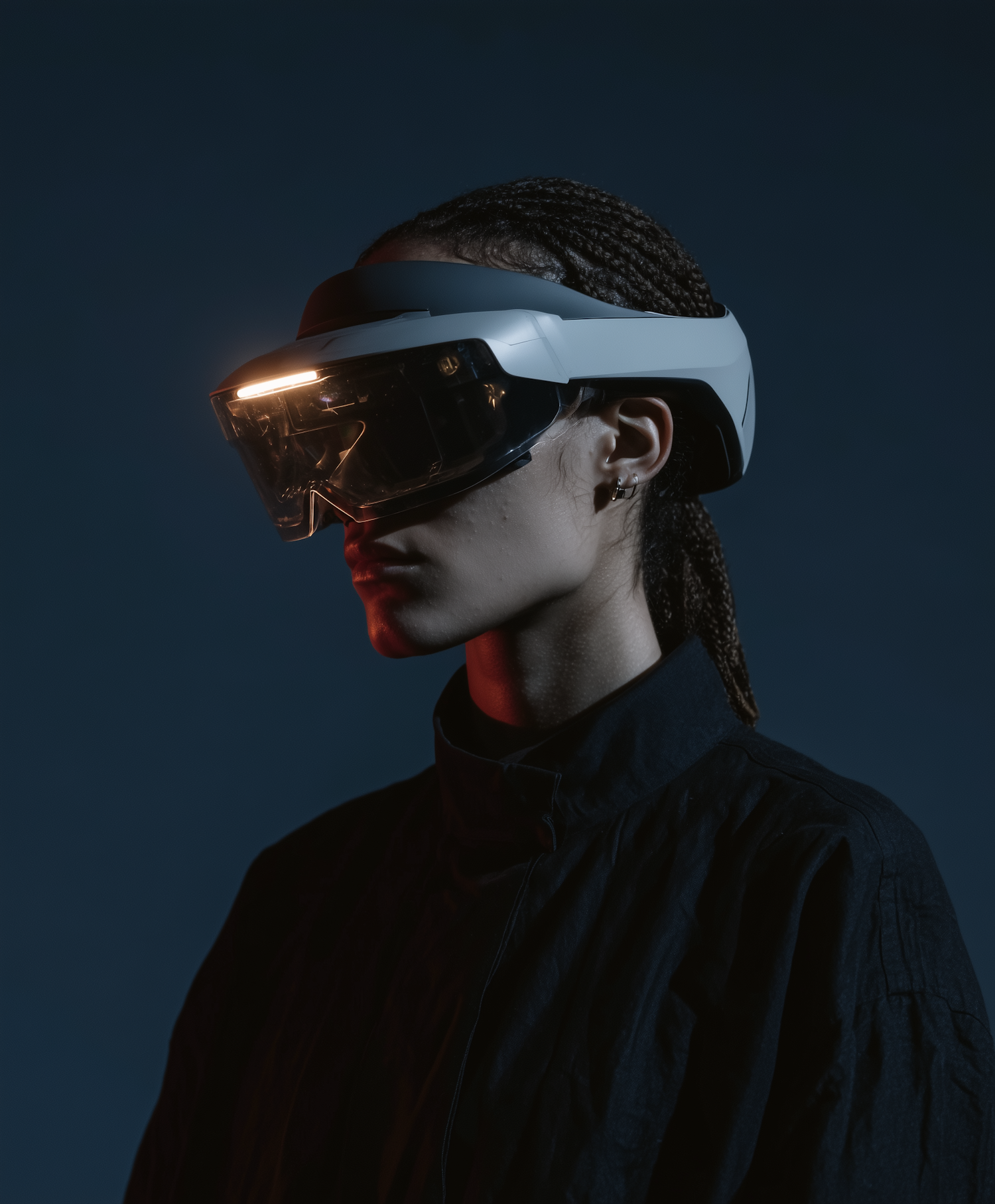 A person wearing a futuristic AR headset in a dimly lit setting, with dramatic lighting and a sleek, modern aesthetic.