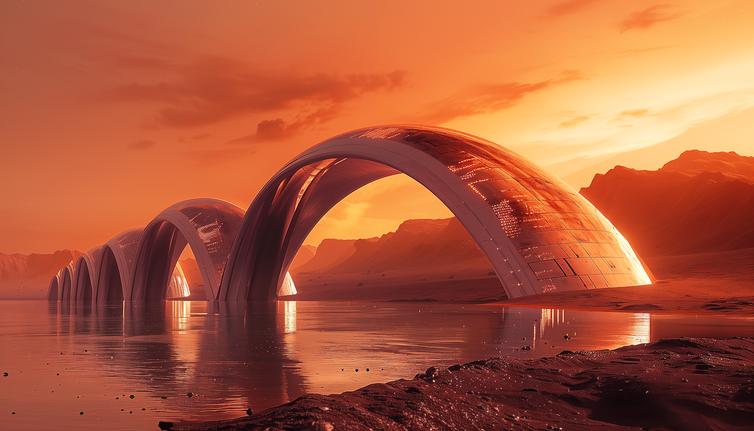 Futuristic metallic arches over a serene water body at sunset, with rugged mountains in the background, creating a Martian-like landscape.