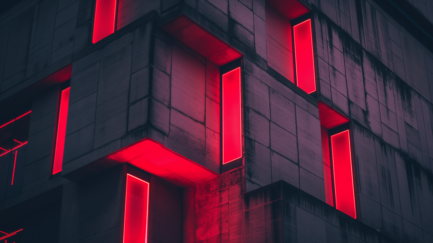 Futuristic building facade with red neon lights highlighting geometric patterns on concrete blocks.