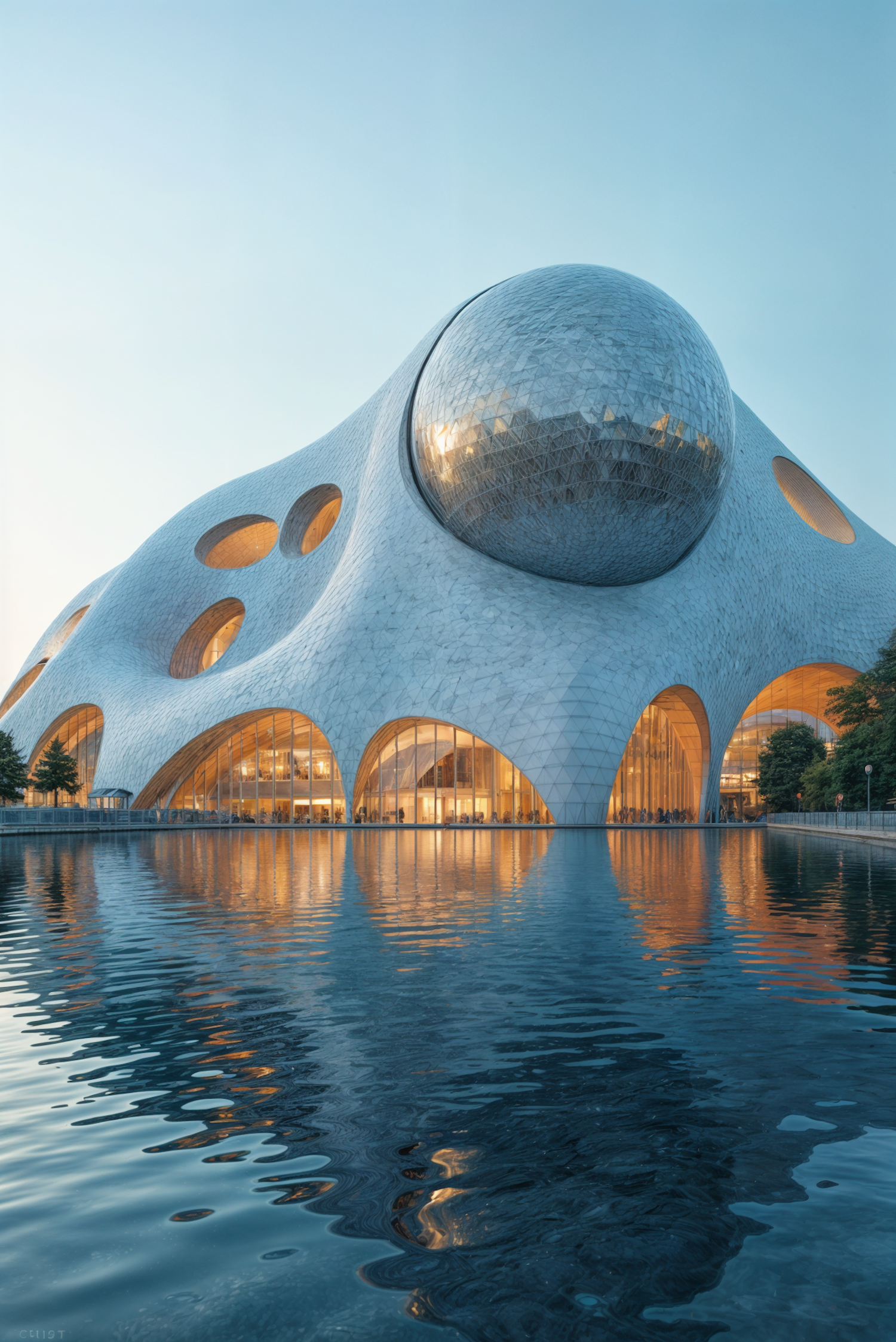 Futuristic building with a reflective dome and circular openings, set by a tranquil water body, glowing warmly under a clear sky.