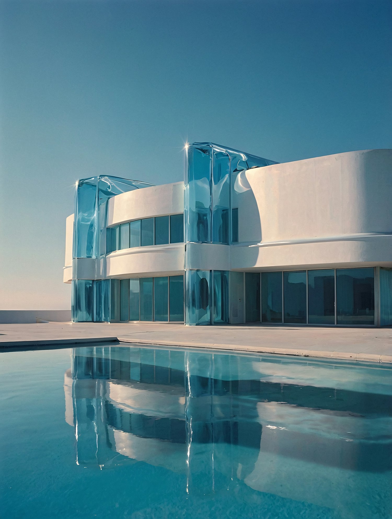 Futuristic white building with reflective blue glass and a serene pool under a clear sky, blending modern luxury and minimalism.