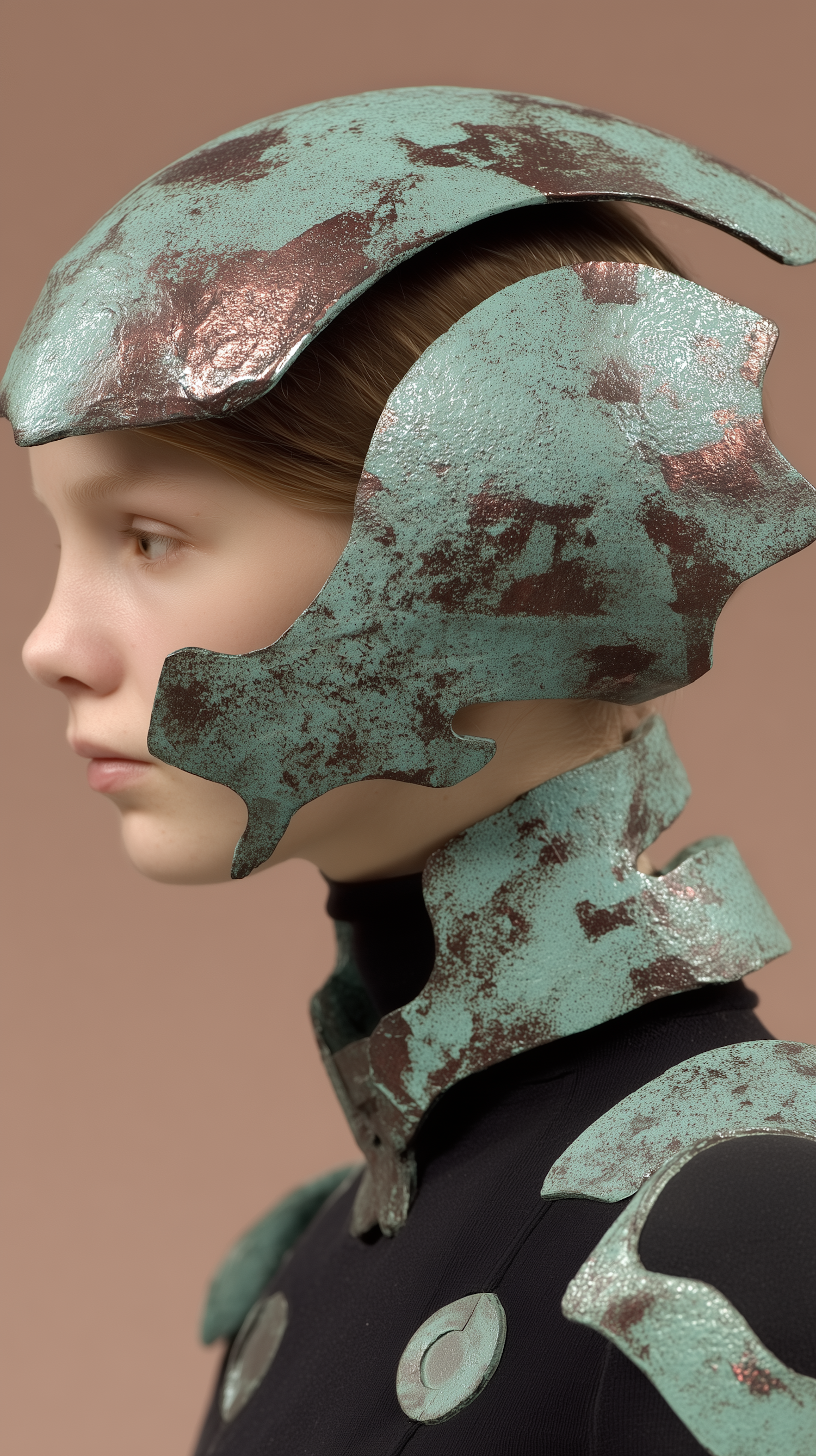 A close-up of a person wearing a turquoise and bronze patina-textured headpiece and armor, set against a neutral background.