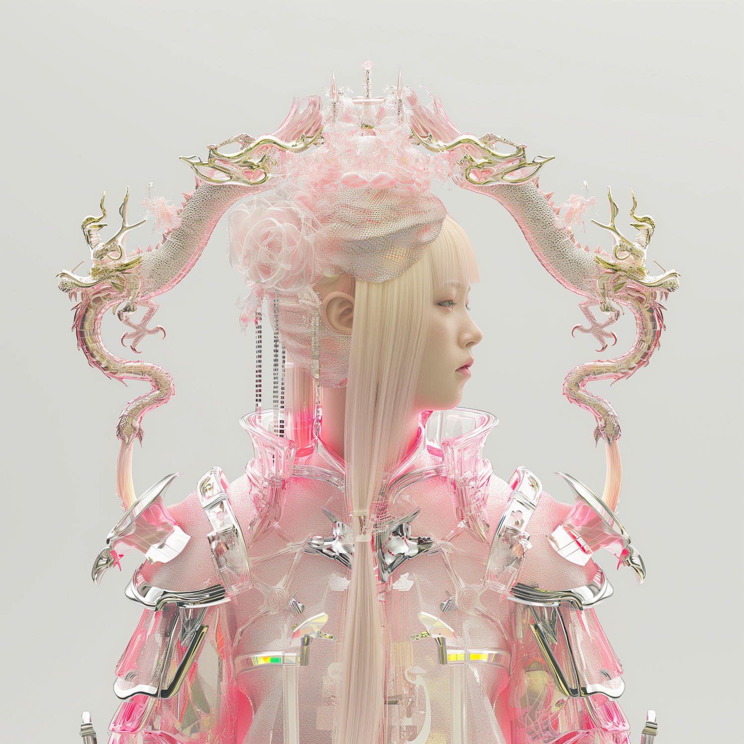 Futuristic Asian woman in translucent attire with dragon headpiece, blending metallic and pink elements in an ethereal design.
