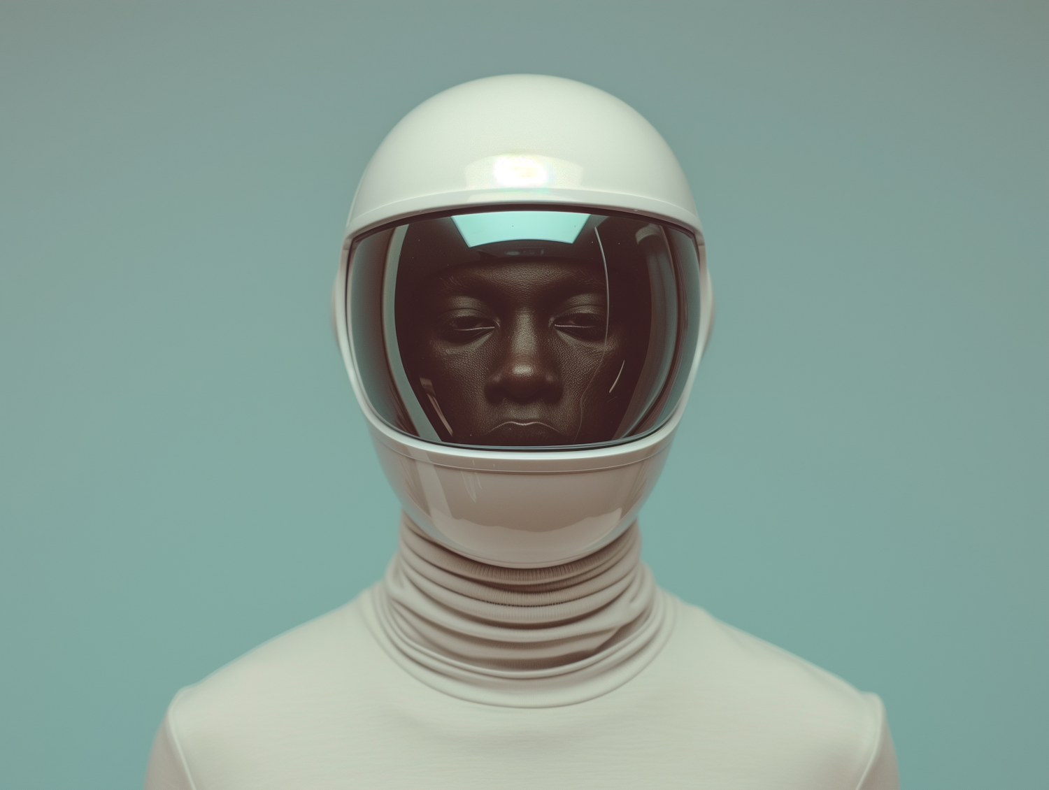 Futuristic portrait of a person in a sleek white helmet with a reflective visor against a teal background.