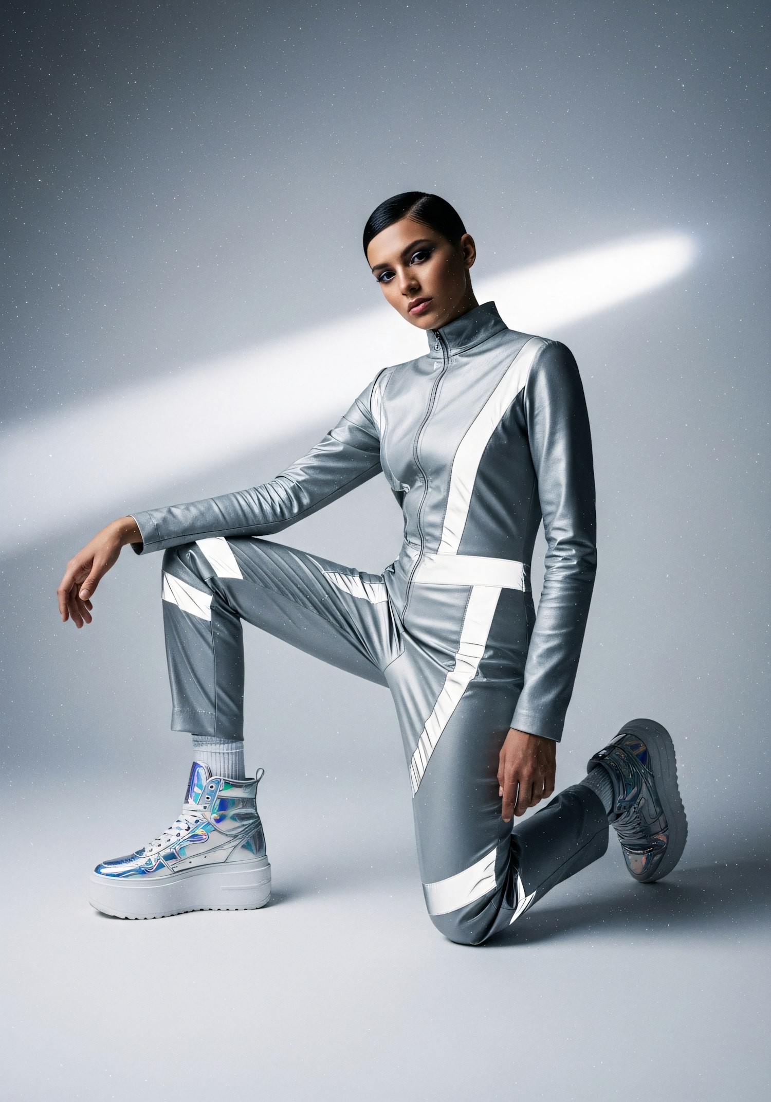 A person in a metallic silver outfit with holographic sneakers kneels confidently in a futuristic setting with minimalistic lighting.