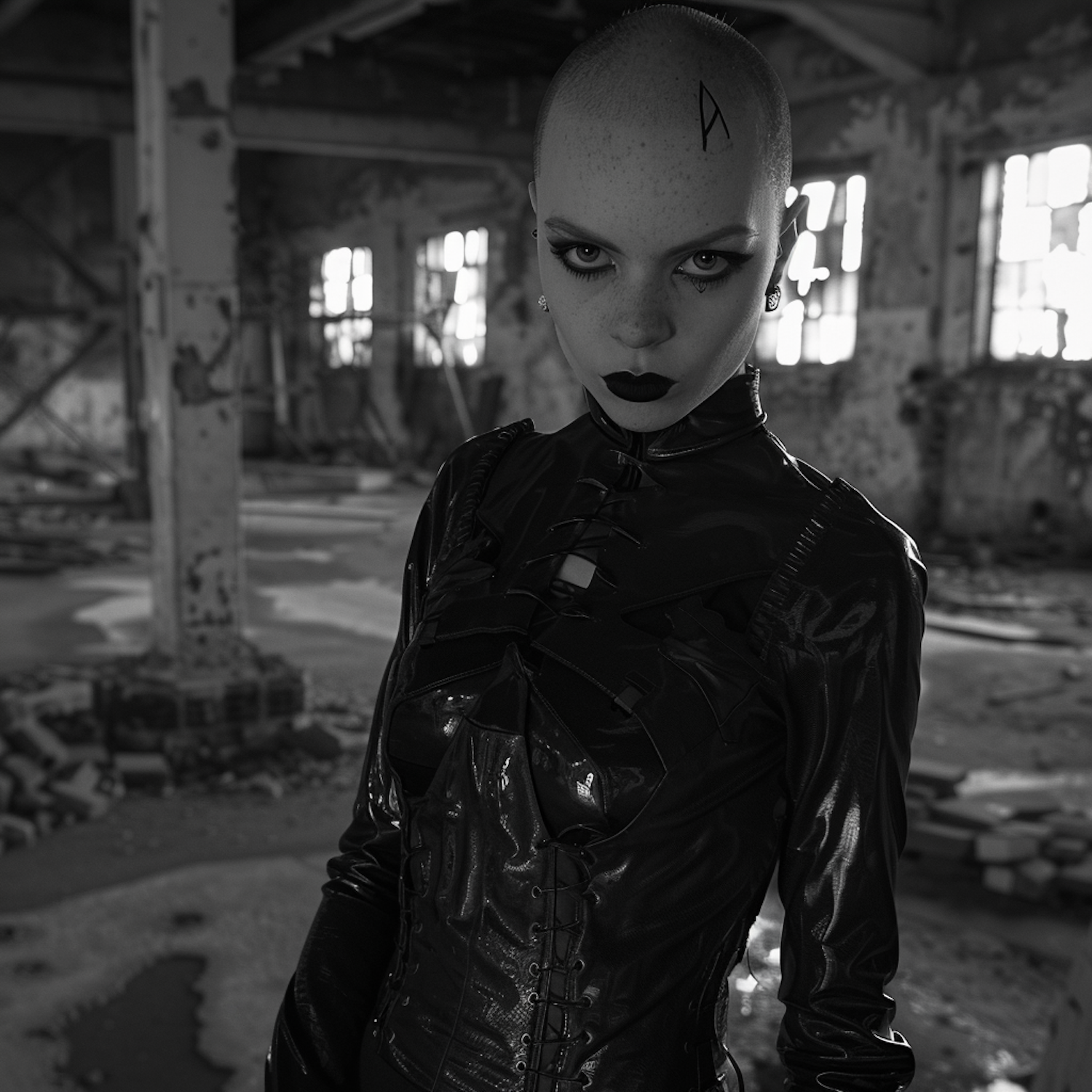 Gothic figure in black latex attire stands in an abandoned building, exuding mystery and intensity in a monochrome setting.