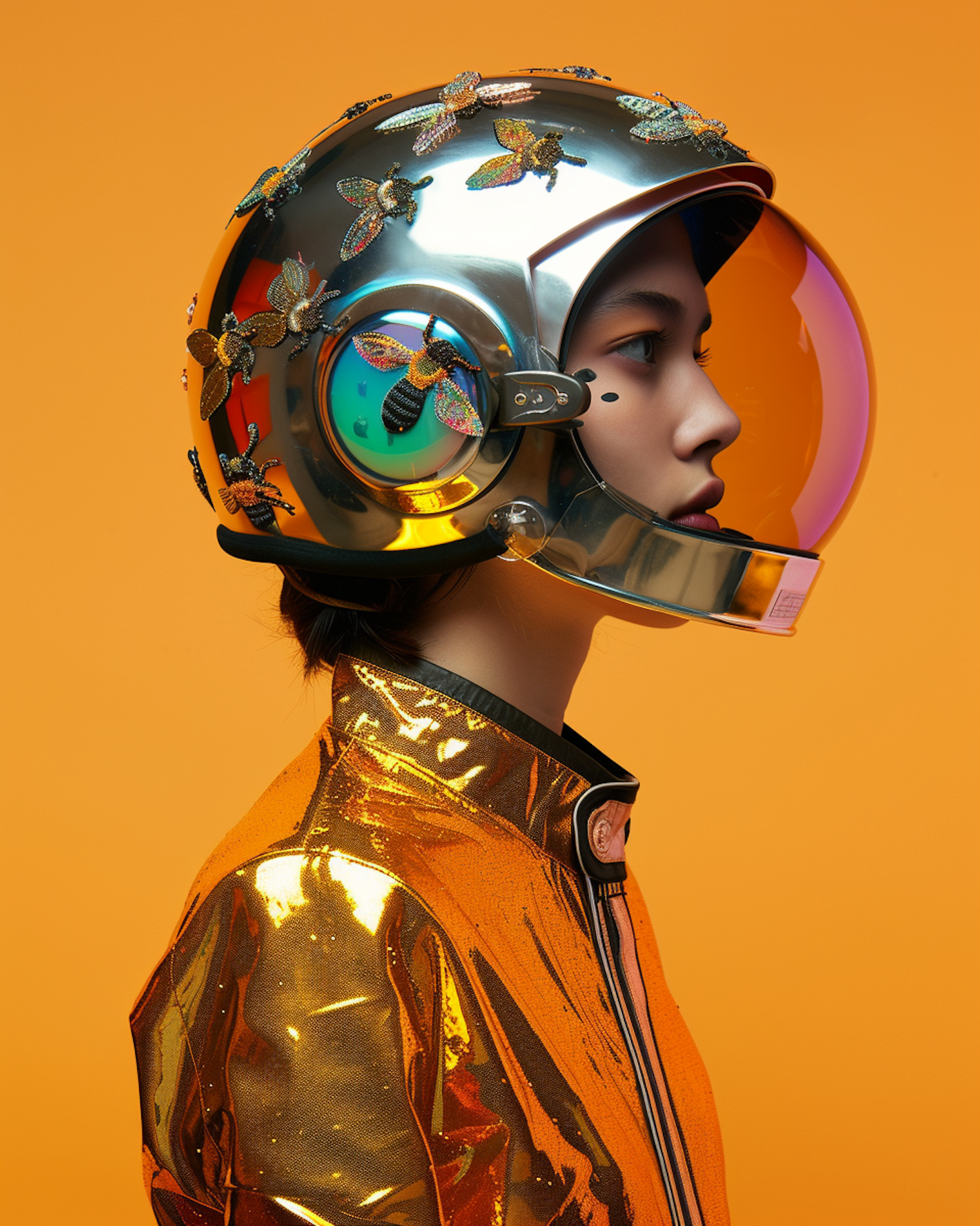 Futuristic portrait of a person in a bee-adorned chrome helmet and golden jacket against a vibrant orange background.