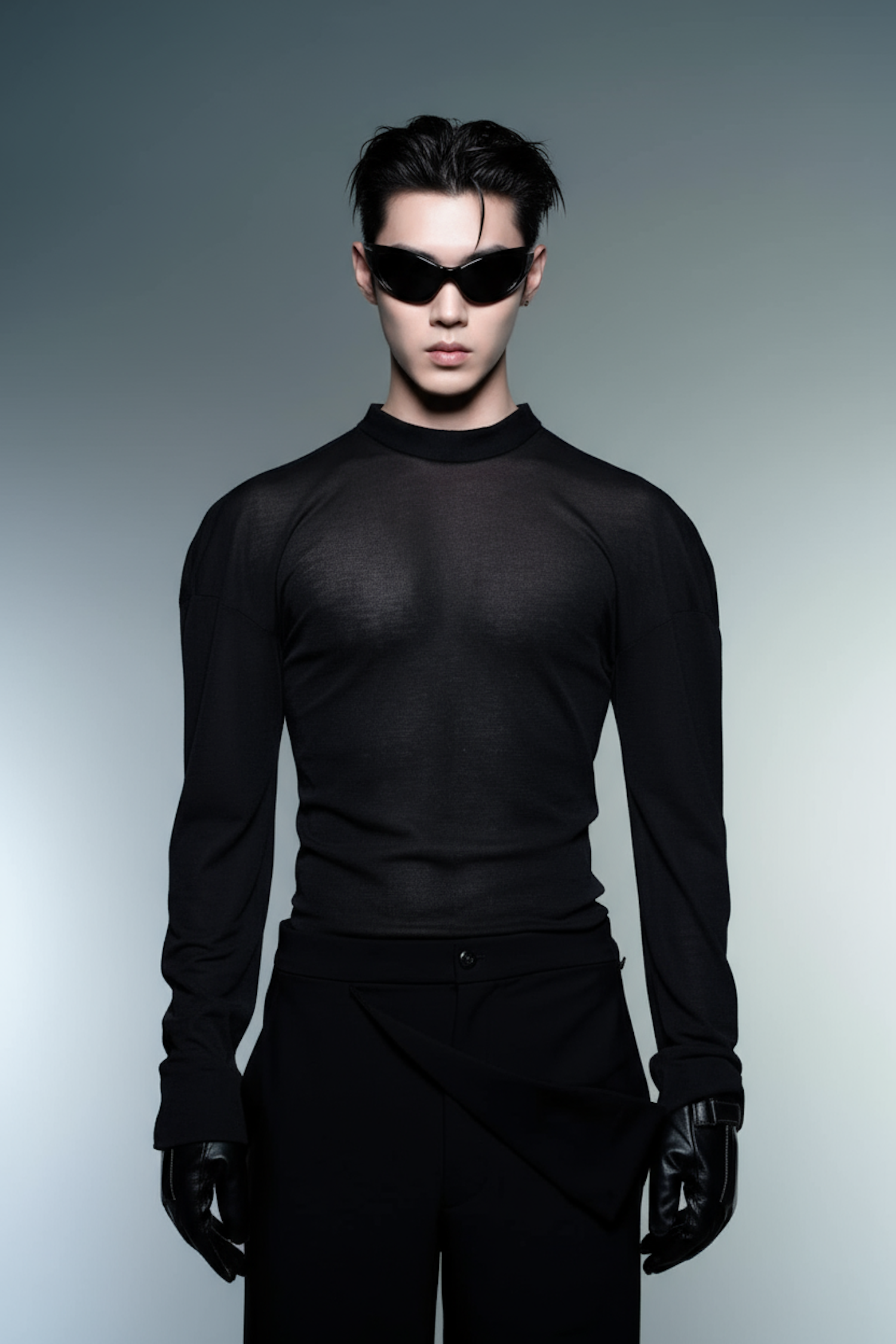 A stylish individual in a sleek black outfit with gloves and sunglasses, set against a gradient background, exuding a modern aesthetic.