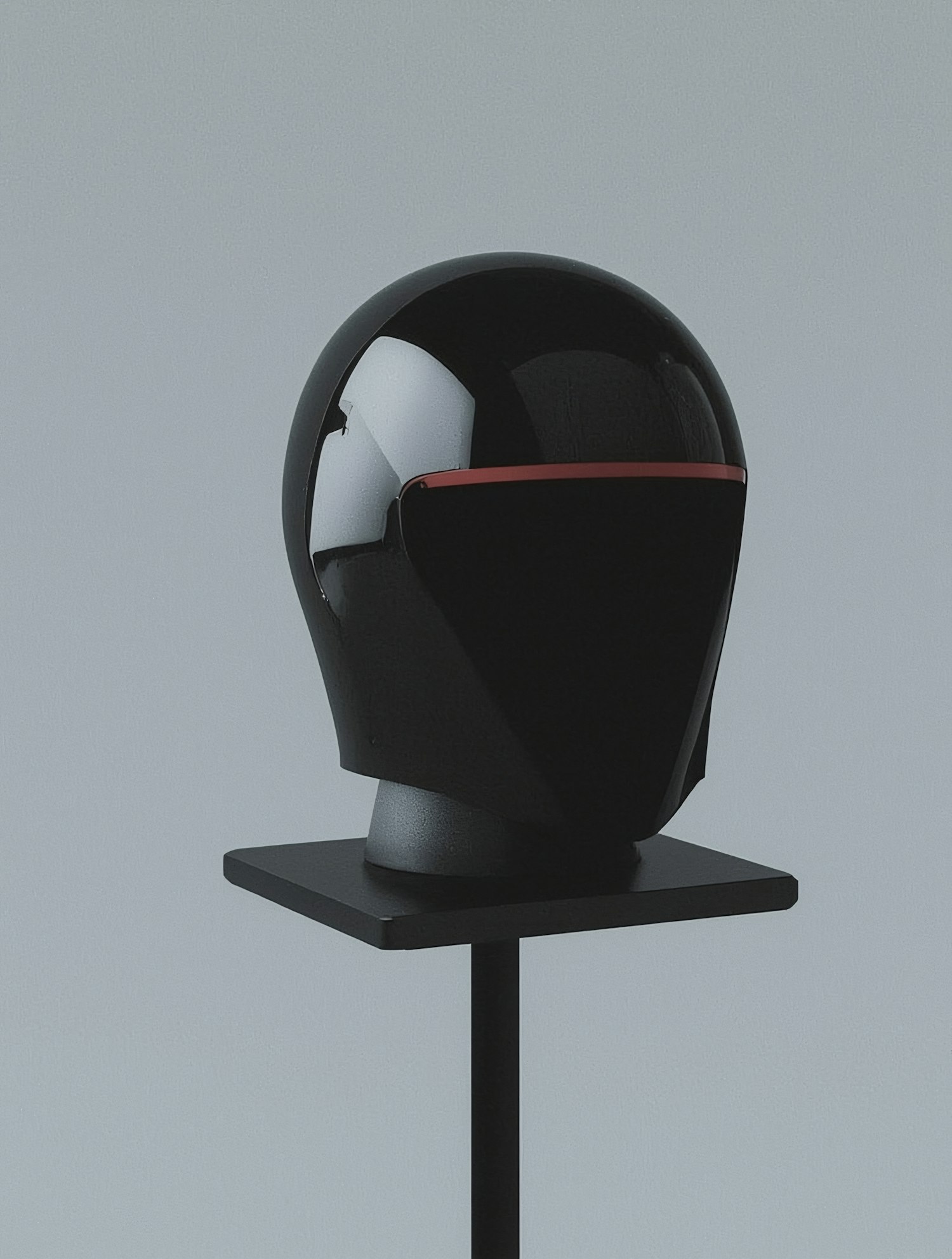 Futuristic black helmet with a red visor line on a stand, perfect for sci-fi enthusiasts or modern design lovers.
