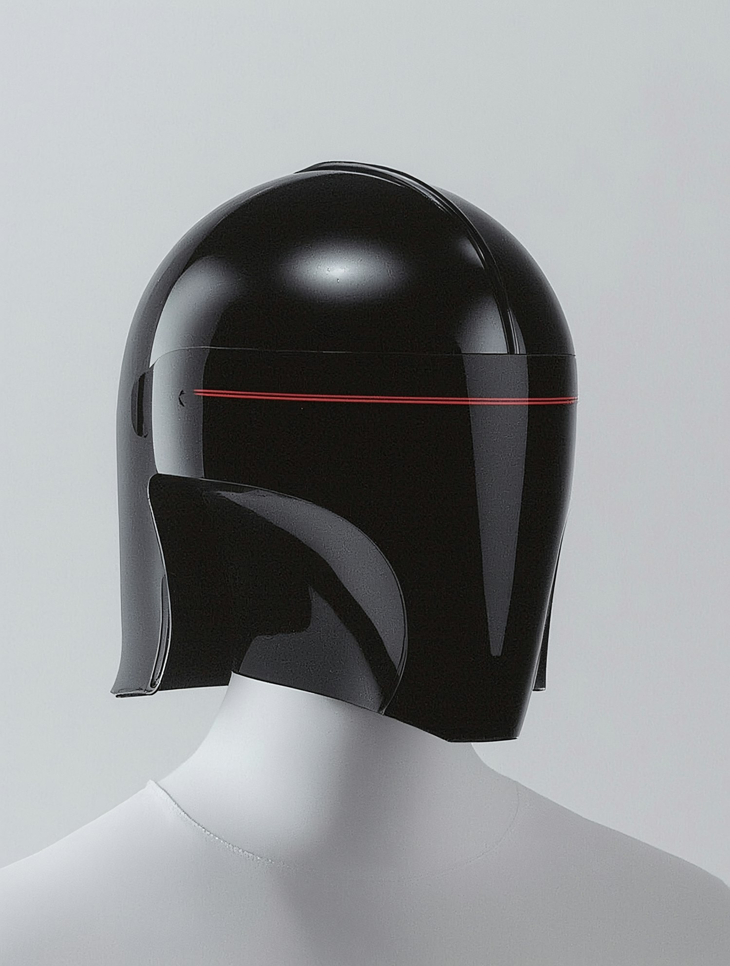 Glossy black helmet with a red stripe, featuring a futuristic design, displayed on a white mannequin against a light gray background.
