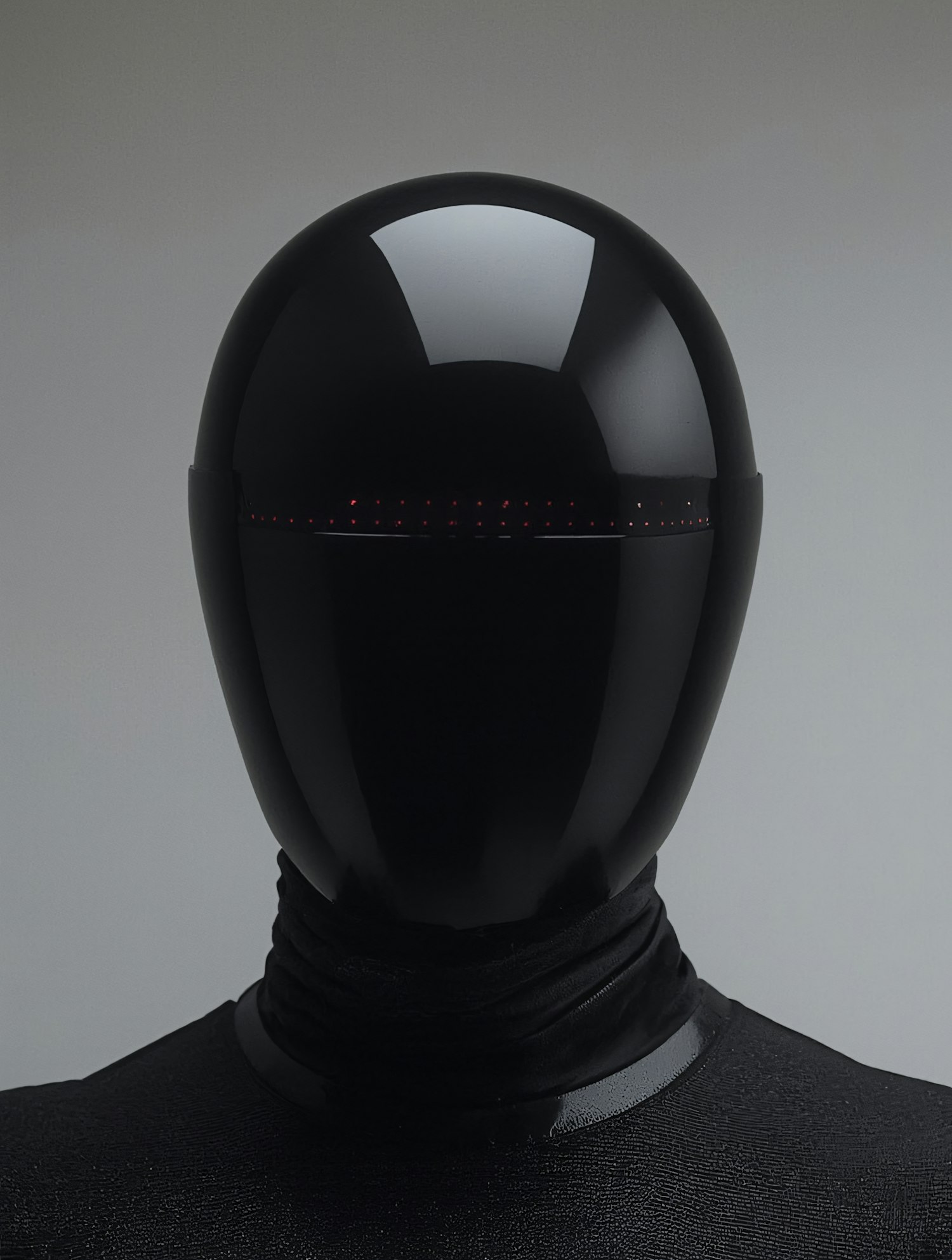 Futuristic black helmet with a glossy finish and red light accents, worn with a sleek black outfit against a neutral background.