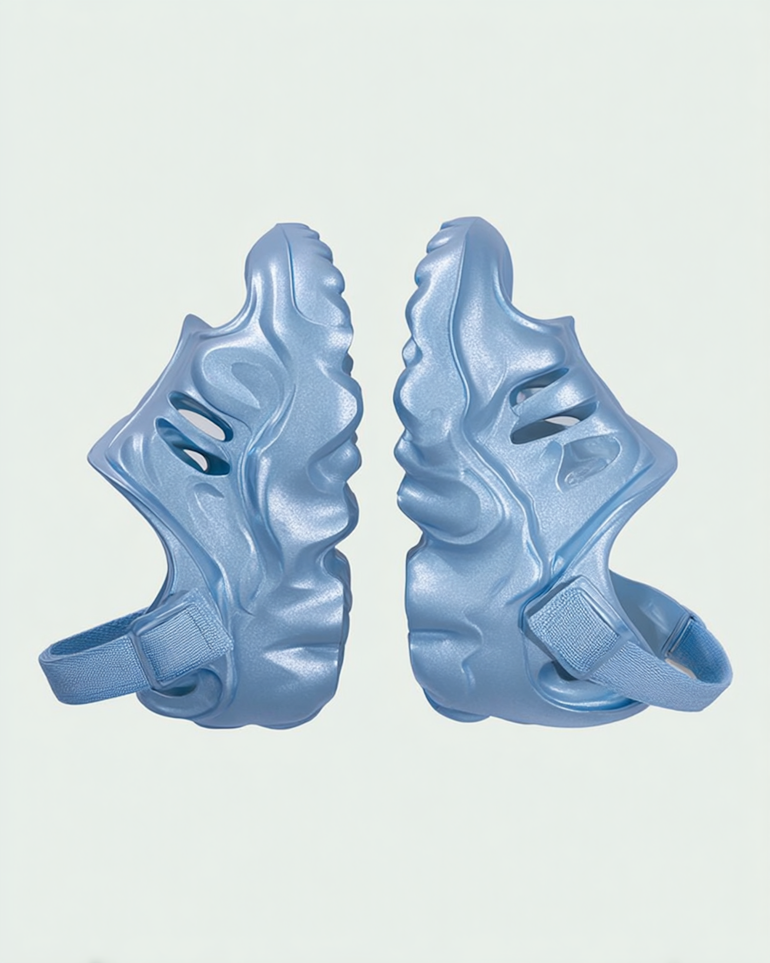 Futuristic metallic blue shoes with a wavy design and cut-outs, featuring a glossy finish and back straps for a secure fit.