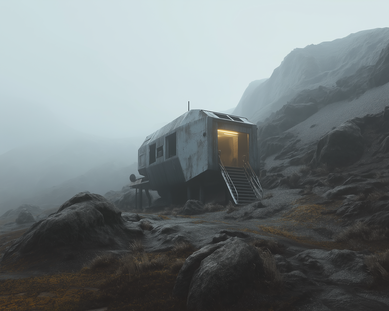 A futuristic cabin on a misty, rocky terrain with a glowing entrance, creating a stark contrast against the desolate, foggy surroundings.