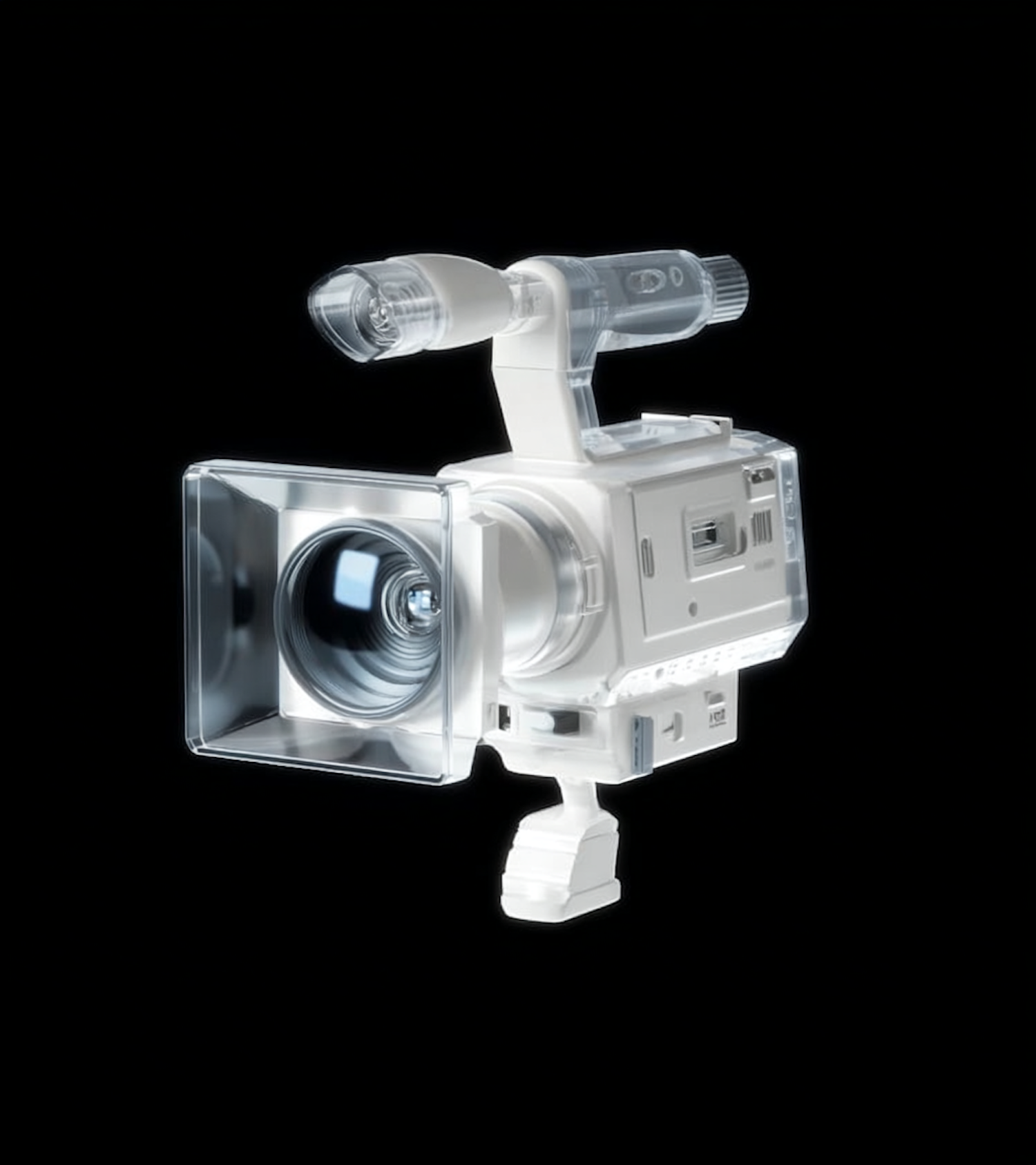 A sleek, translucent video camera design with visible internal details, set against a black background for a futuristic aesthetic.