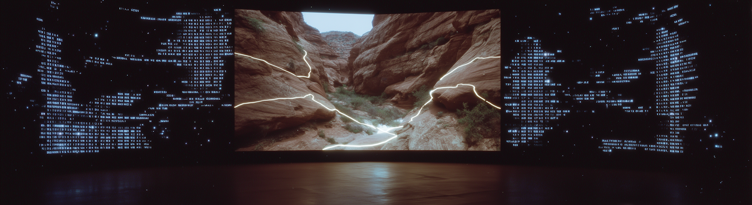 A digital display of a canyon scene with glowing lines, surrounded by a futuristic interface of text and symbols.