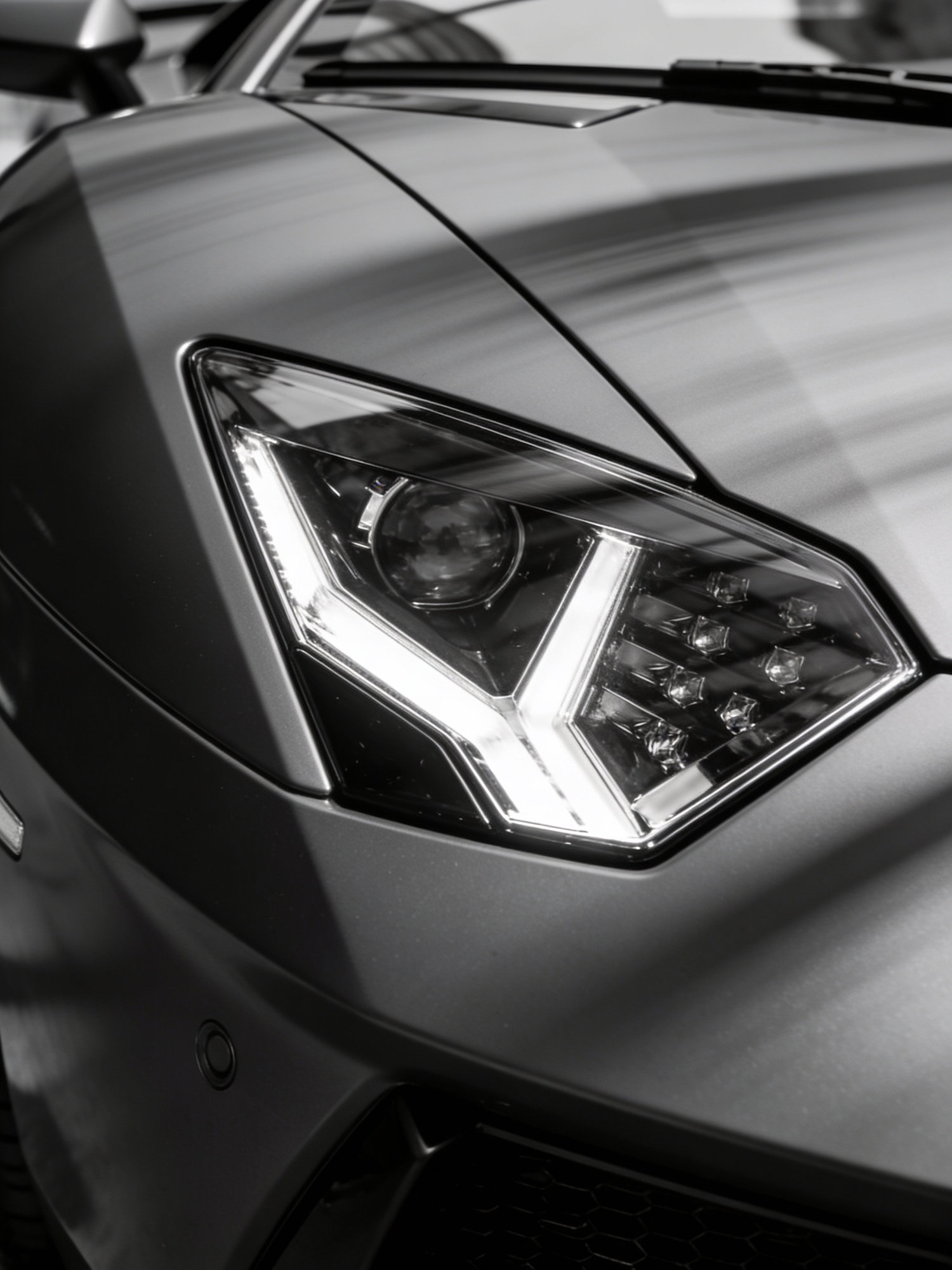 supercar headlamp unit, sharp geometric light housing integrated into sculpted bodywork, cinematic motion blur streaking across the hood surface, metallic trim and glass edges sharply reflective, deep motorsport shadows, dark grey monochrome palette, graphite and steel tones