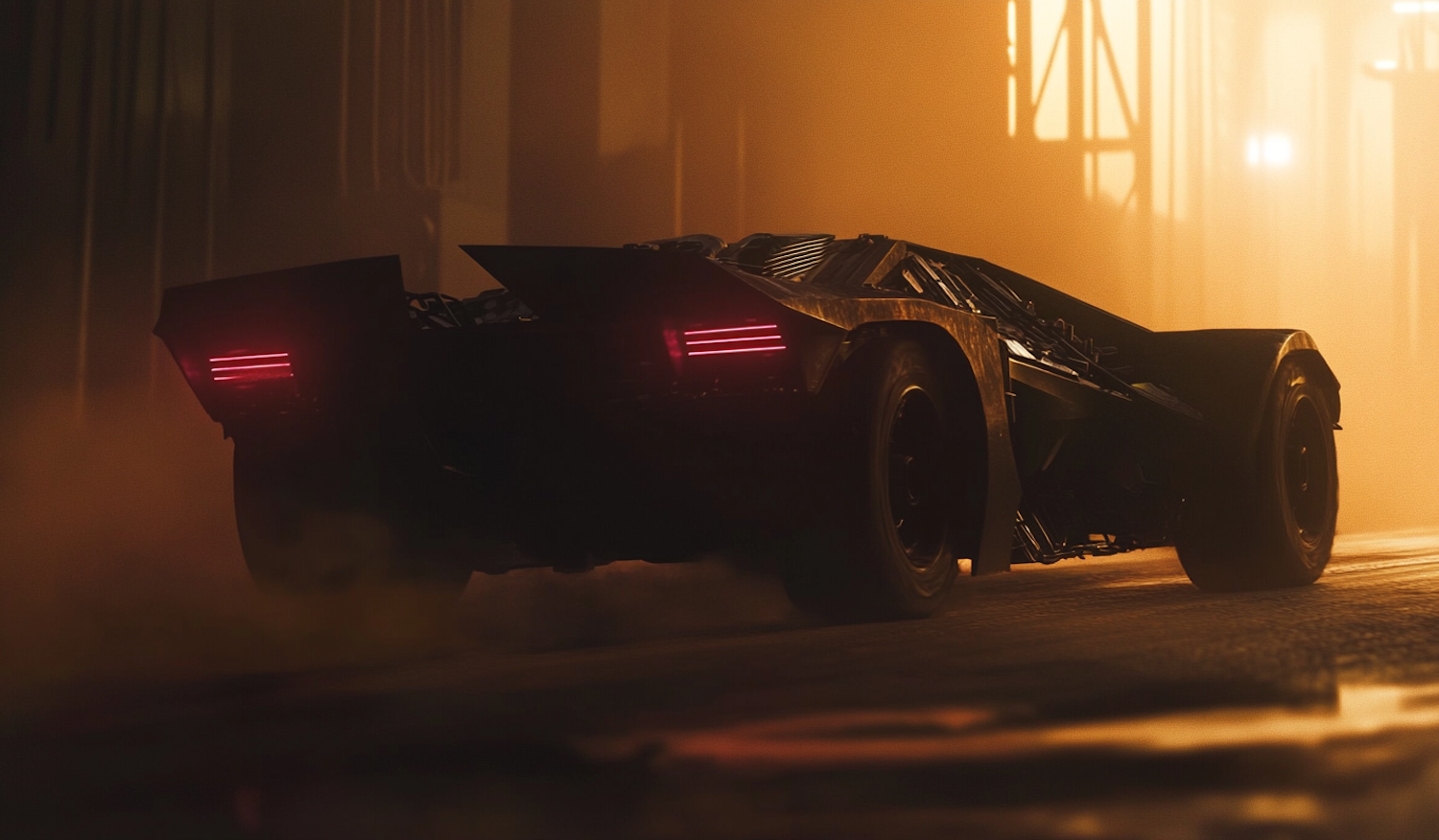 Futuristic car with red rear lights in a dim, atmospheric setting with warm orange glow and dramatic shadows.