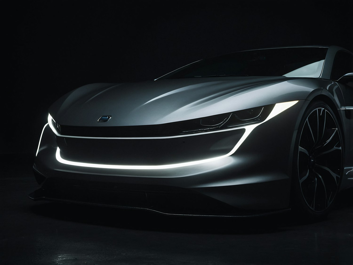 Futuristic silver car with sleek design, illuminated headlights, and stylish wheels in a dimly lit setting.