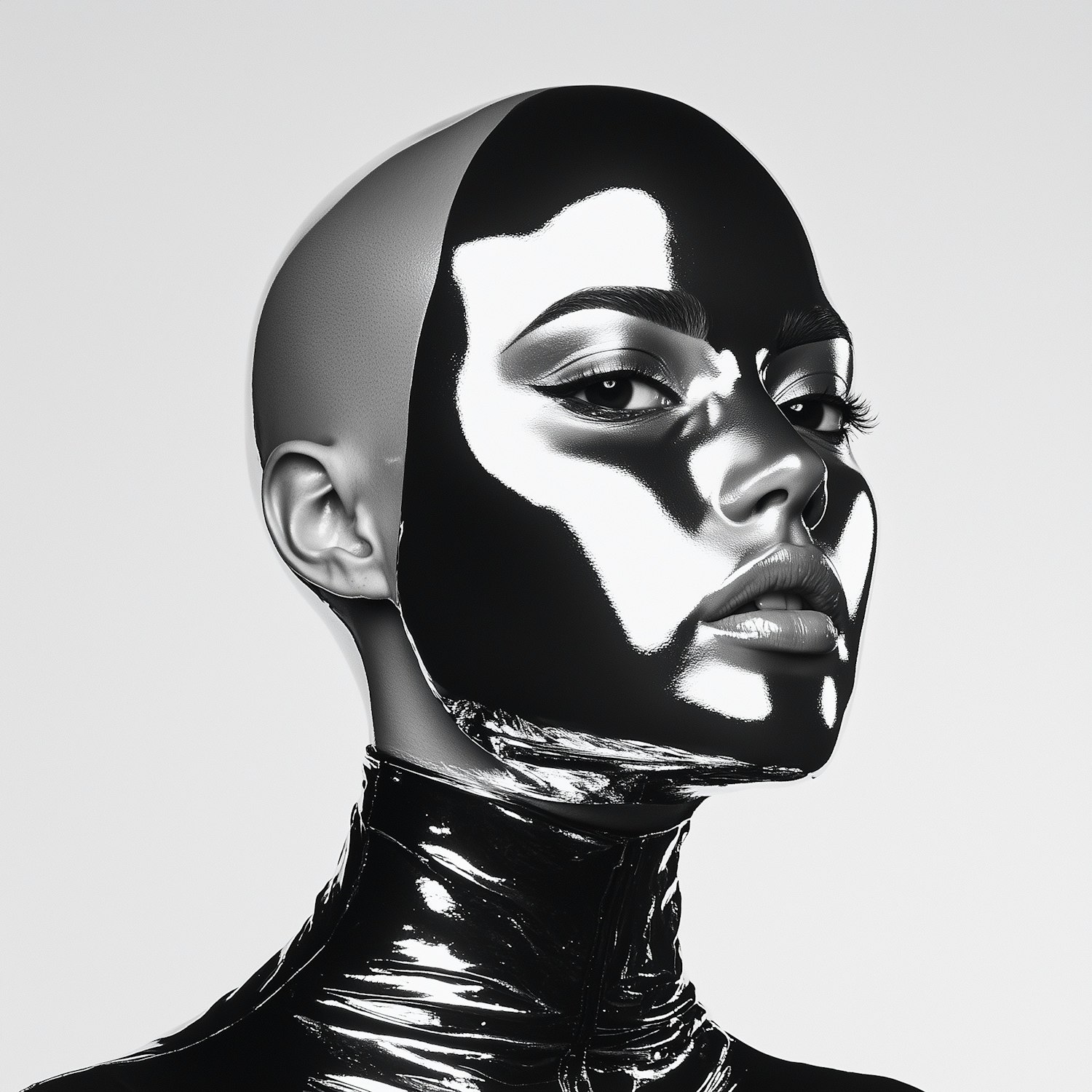 Futuristic portrait of a person with a chrome-like face and glossy black outfit, blending cyberpunk aesthetics with modern art.