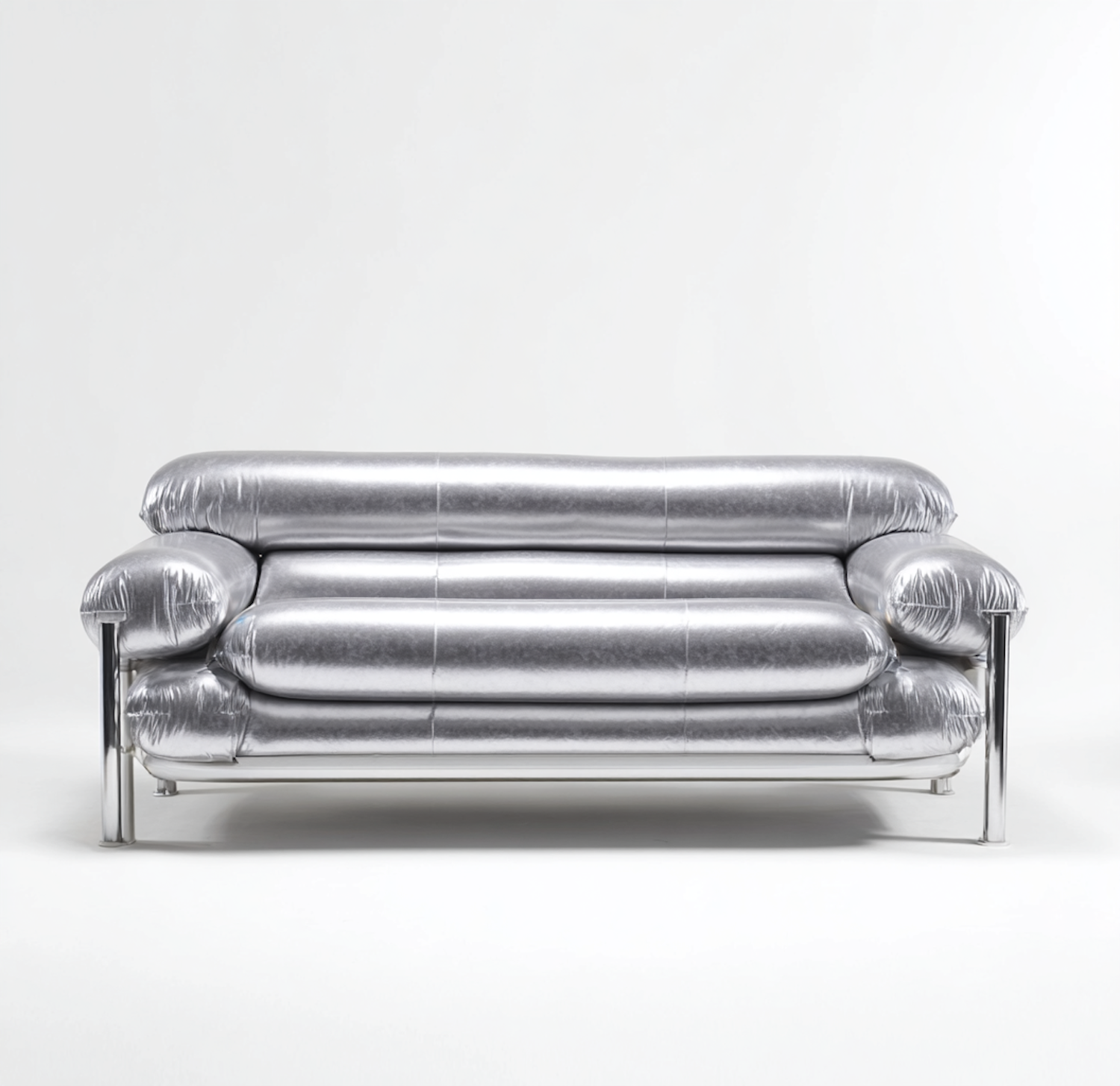 A sleek silver sofa with a futuristic design, featuring tubular cushions and a chrome frame, perfect for modern interiors.