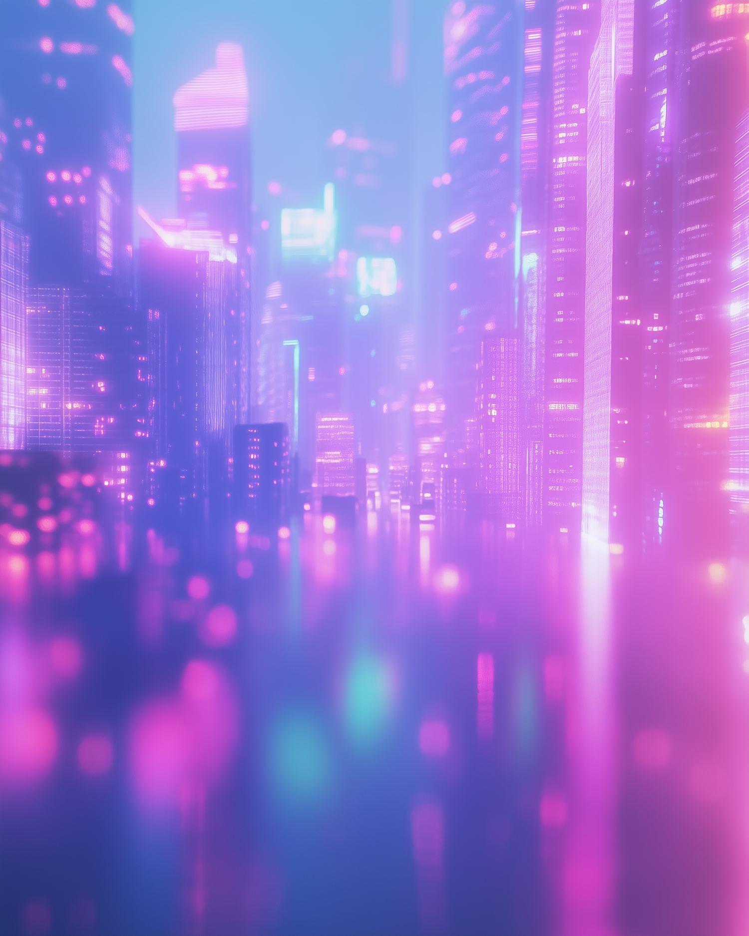 Futuristic cityscape with neon lights in pink, purple, and blue, creating a dreamy cyberpunk atmosphere with glowing skyscrapers.