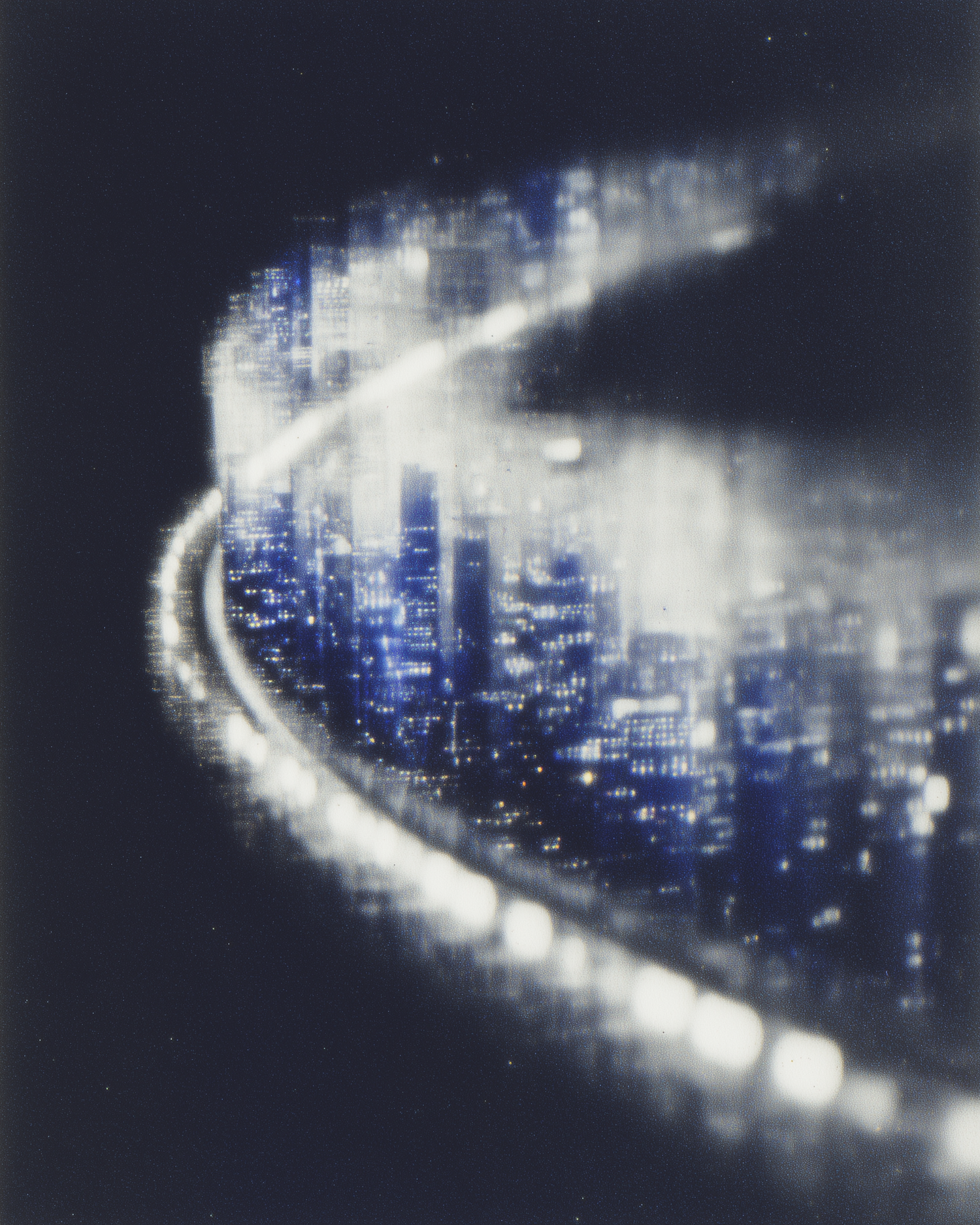 Dreamy futuristic cityscape with glowing blue and white lights, blurred skyscrapers, and an elevated illuminated pathway.