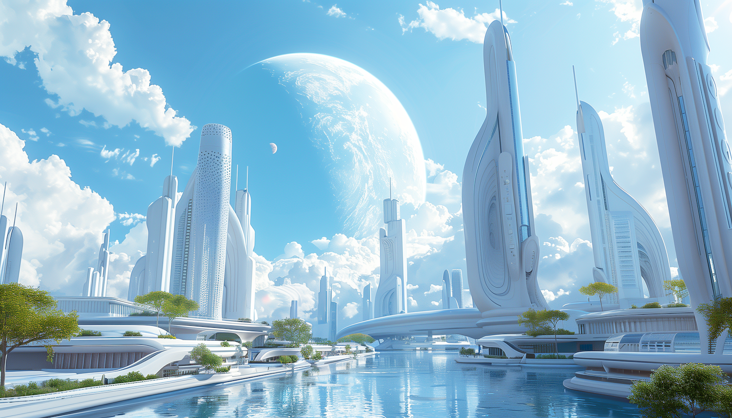 Futuristic cityscape with sleek skyscrapers, blue skies, and a distant planet. Modern architecture blends with nature in a serene setting.