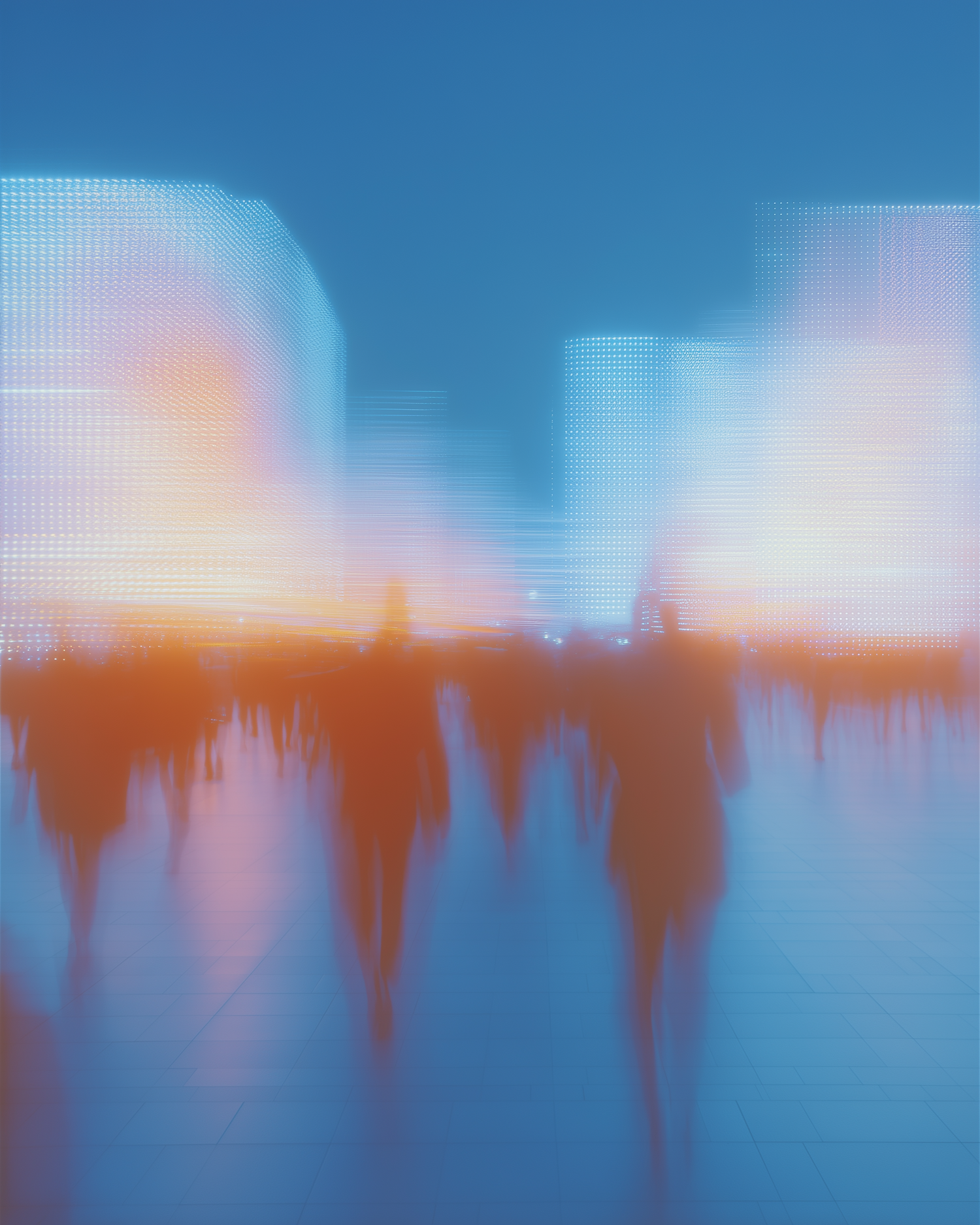 Futuristic cityscape with glowing lights and blurred silhouettes of people walking, creating a surreal cyberpunk vibe.