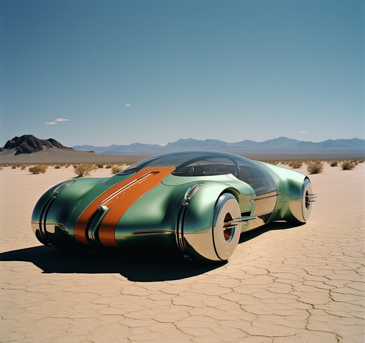 Futuristic green and orange car on a desert landscape, showcasing sleek design and retro-futuristic elements under a clear blue sky.