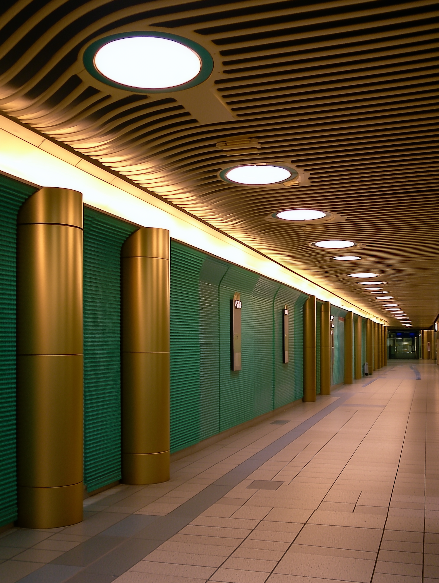 A sleek corridor with green walls, gold columns, and wave-patterned ceiling lights, creating a modern and futuristic vibe.