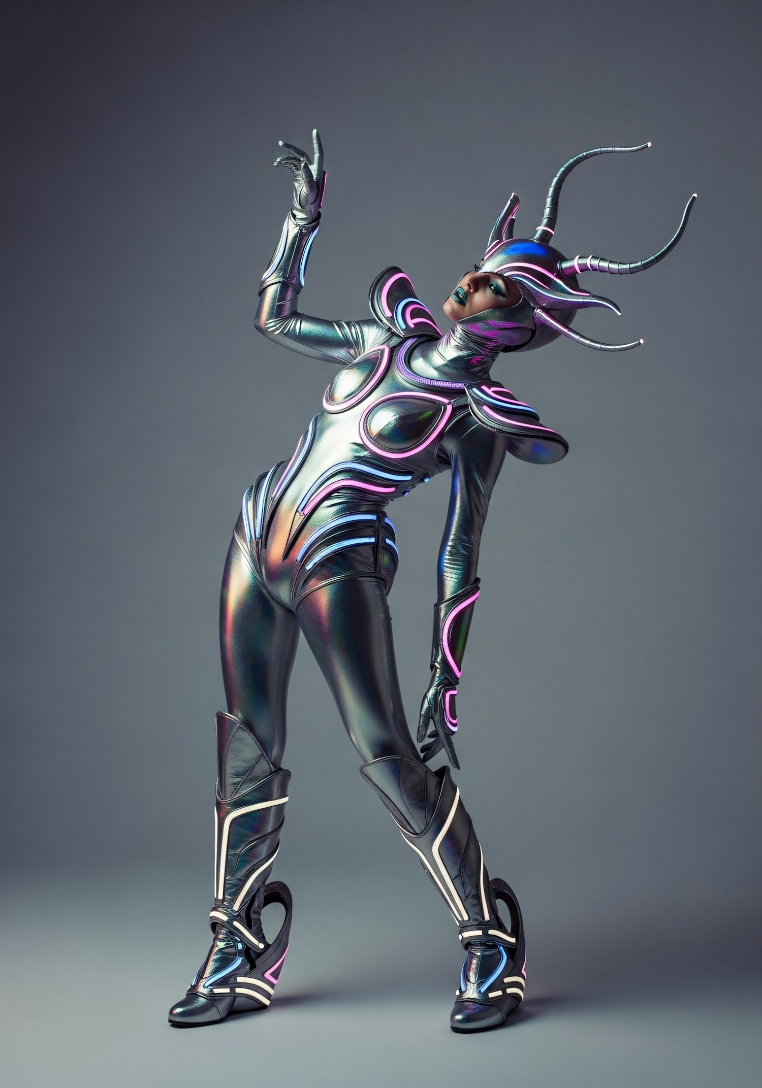 A futuristic costume with glowing accents and metallic sheen, featuring a dramatic pose and intricate design details.