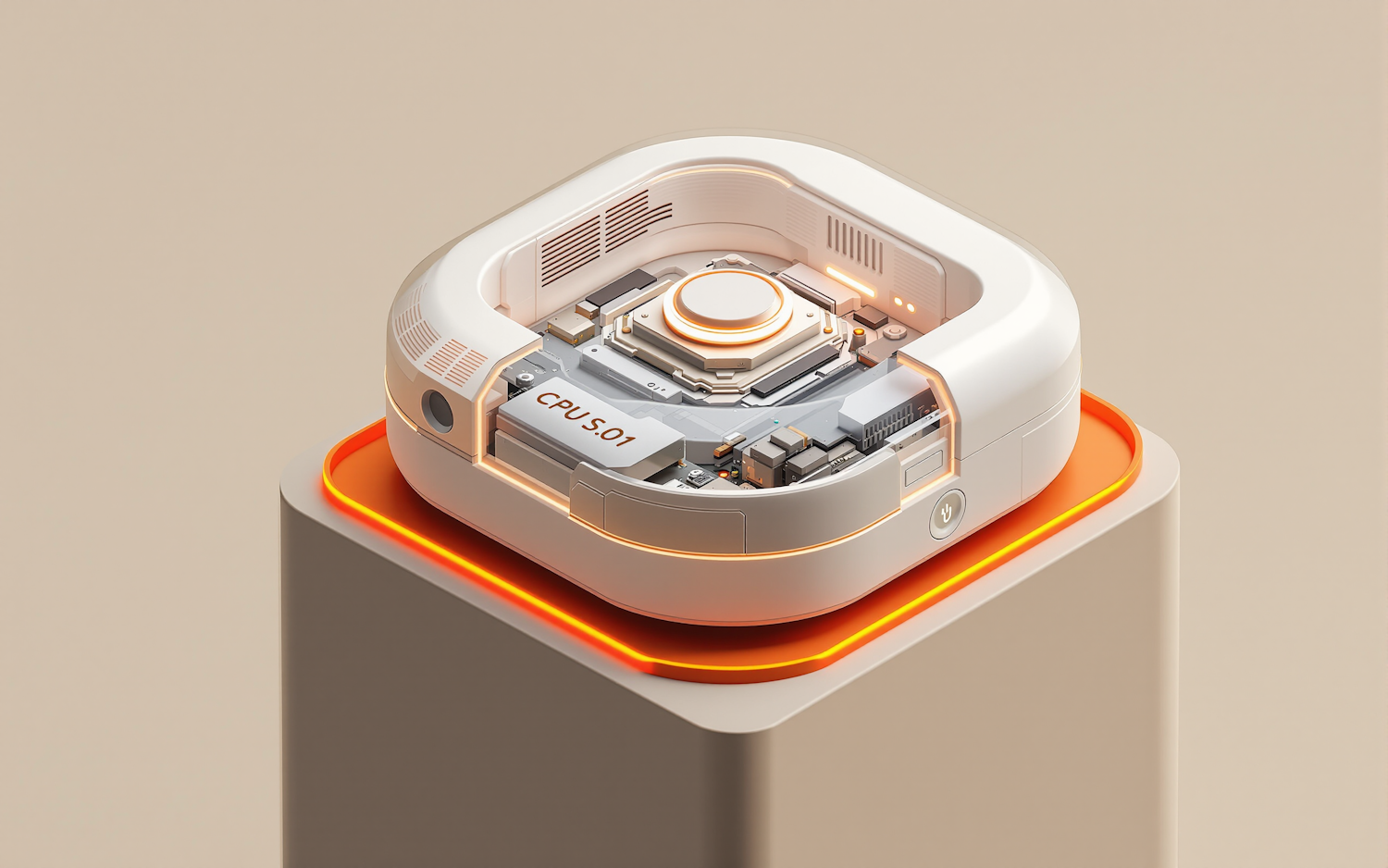 Futuristic white CPU unit with glowing orange accents and visible components, displayed on a sleek pedestal against a beige background.