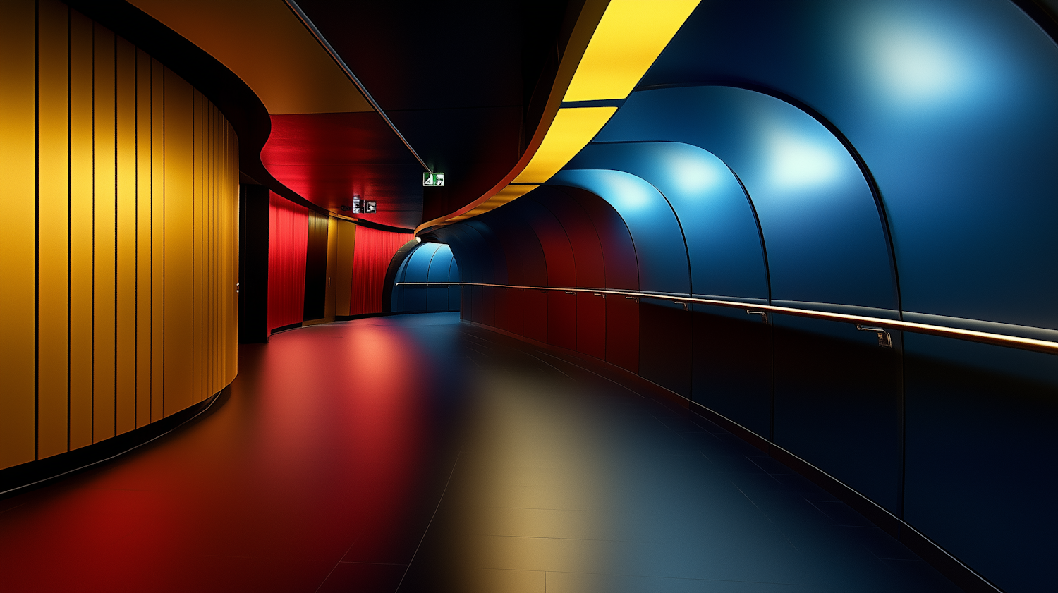 Futuristic corridor with vibrant red, yellow, and blue walls, creating a dynamic and modern atmosphere.