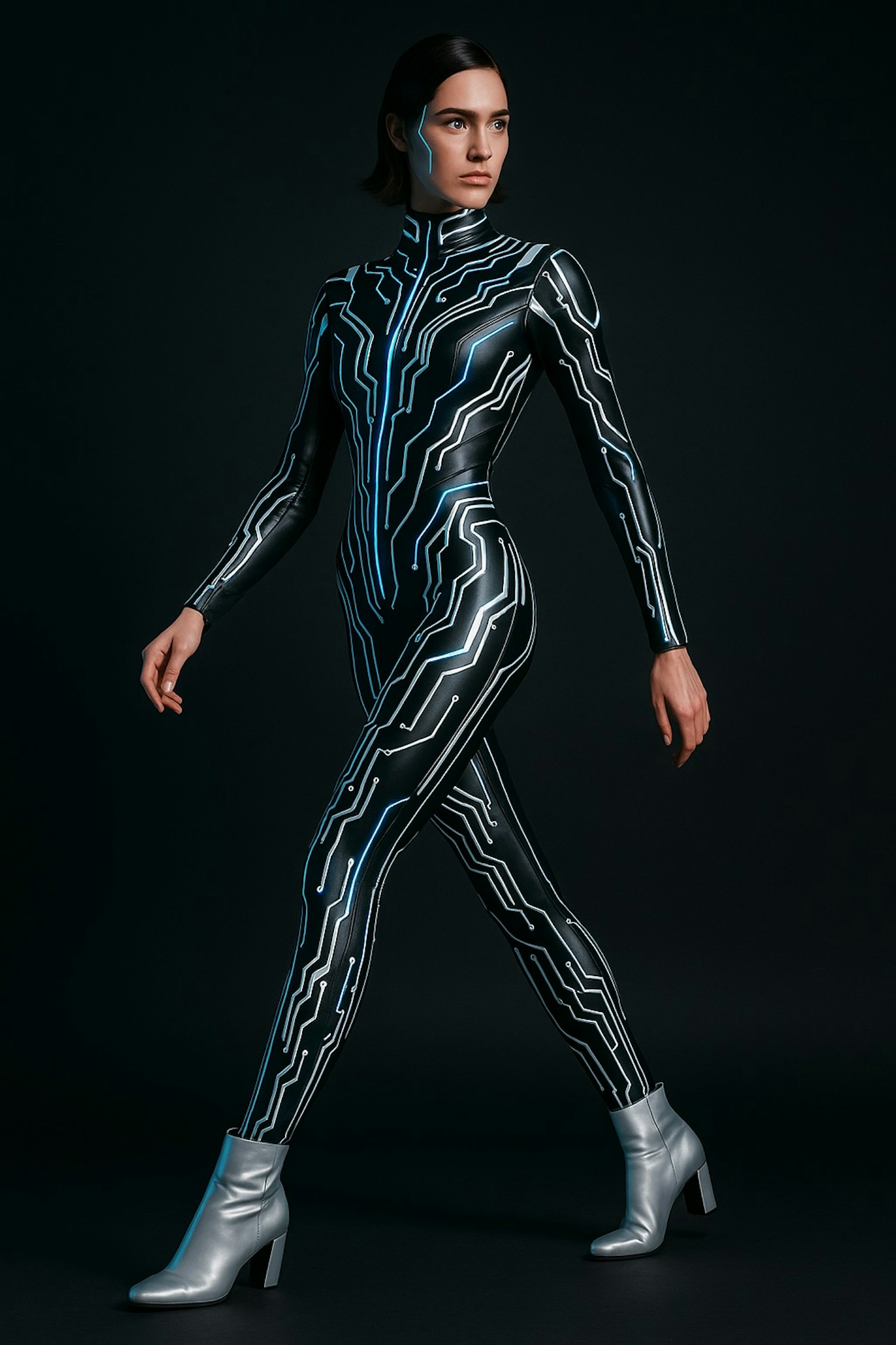 Woman in a glowing black bodysuit with blue circuit patterns, silver boots, and a futuristic vibe against a dark background.