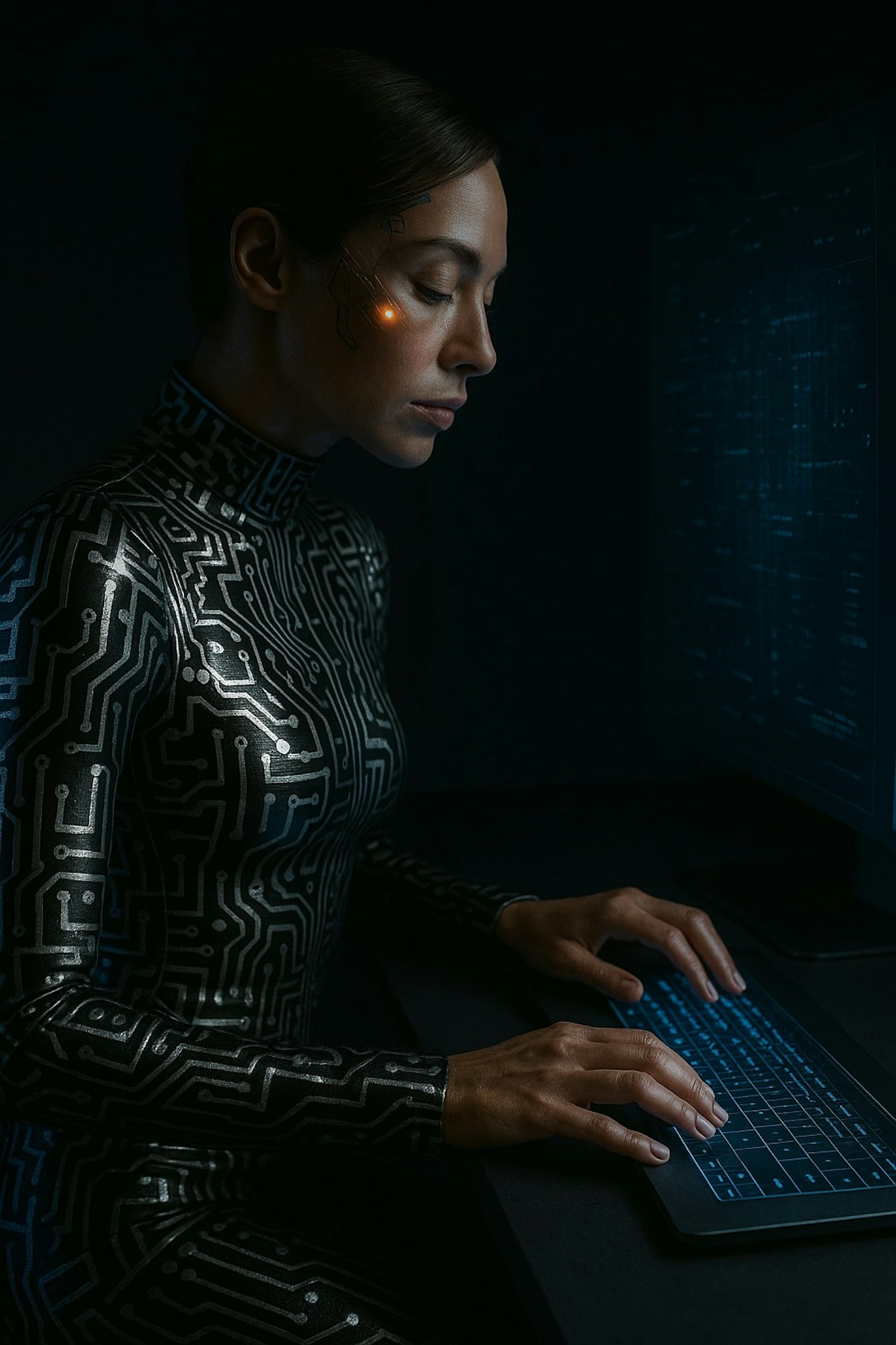 A woman in a circuit-patterned bodysuit with a glowing temple light works on a futuristic keyboard in a dim, tech-inspired setting.