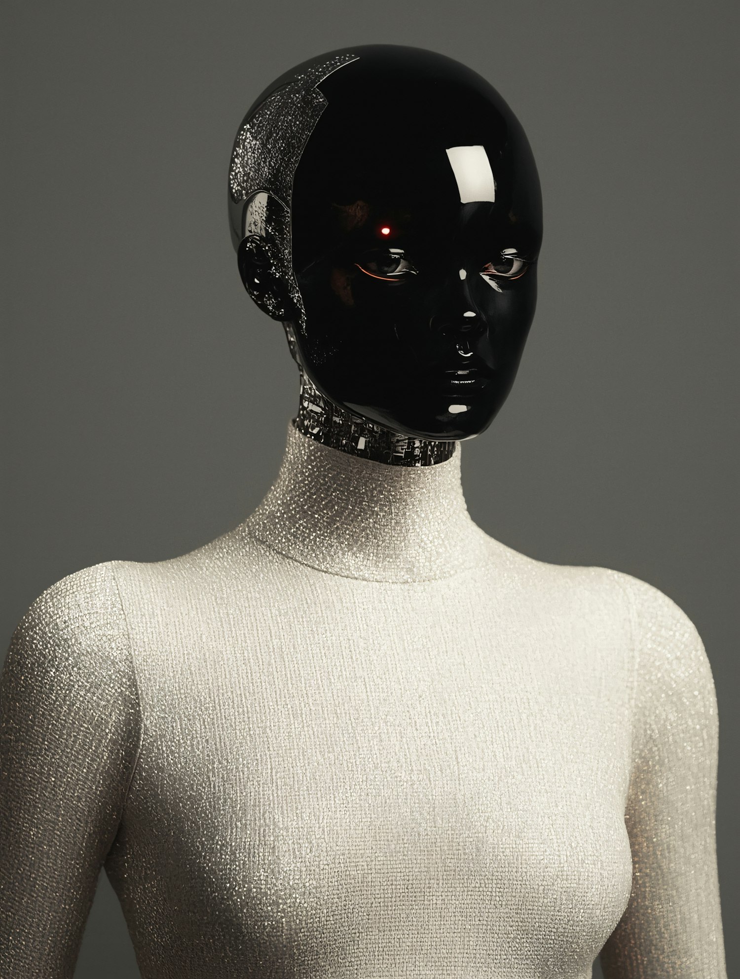Futuristic humanoid robot with a glossy black head and shimmering silver body, featuring a glowing red light for a high-tech look.