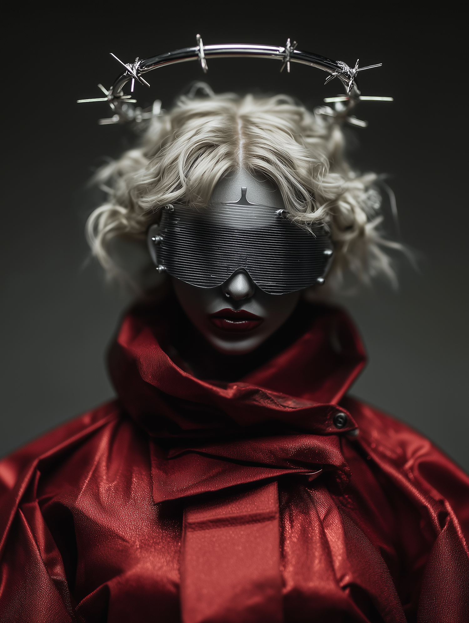 Futuristic portrait of a person with platinum hair, a metallic visor, barbed wire halo, and a bold red outfit against a dark background.