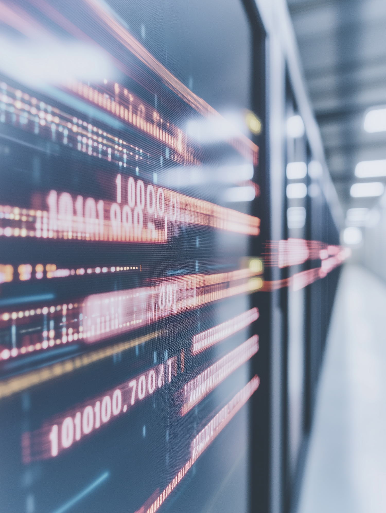 High-tech data center with glowing binary code on a digital screen, sleek server racks, and a futuristic, modern atmosphere.