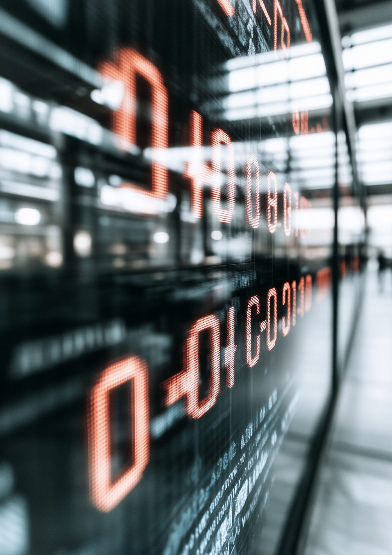 Close-up of a digital display with glowing red numbers, reflecting a modern tech or financial environment. Futuristic and sleek design.