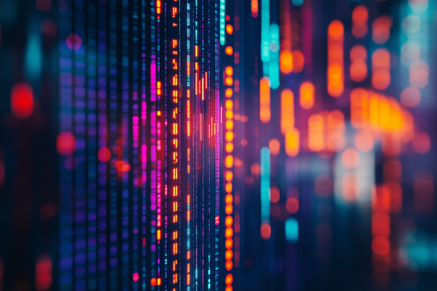 Abstract digital art with glowing orange, blue, and pink lights in vertical patterns, evoking a futuristic data stream or tech interface.