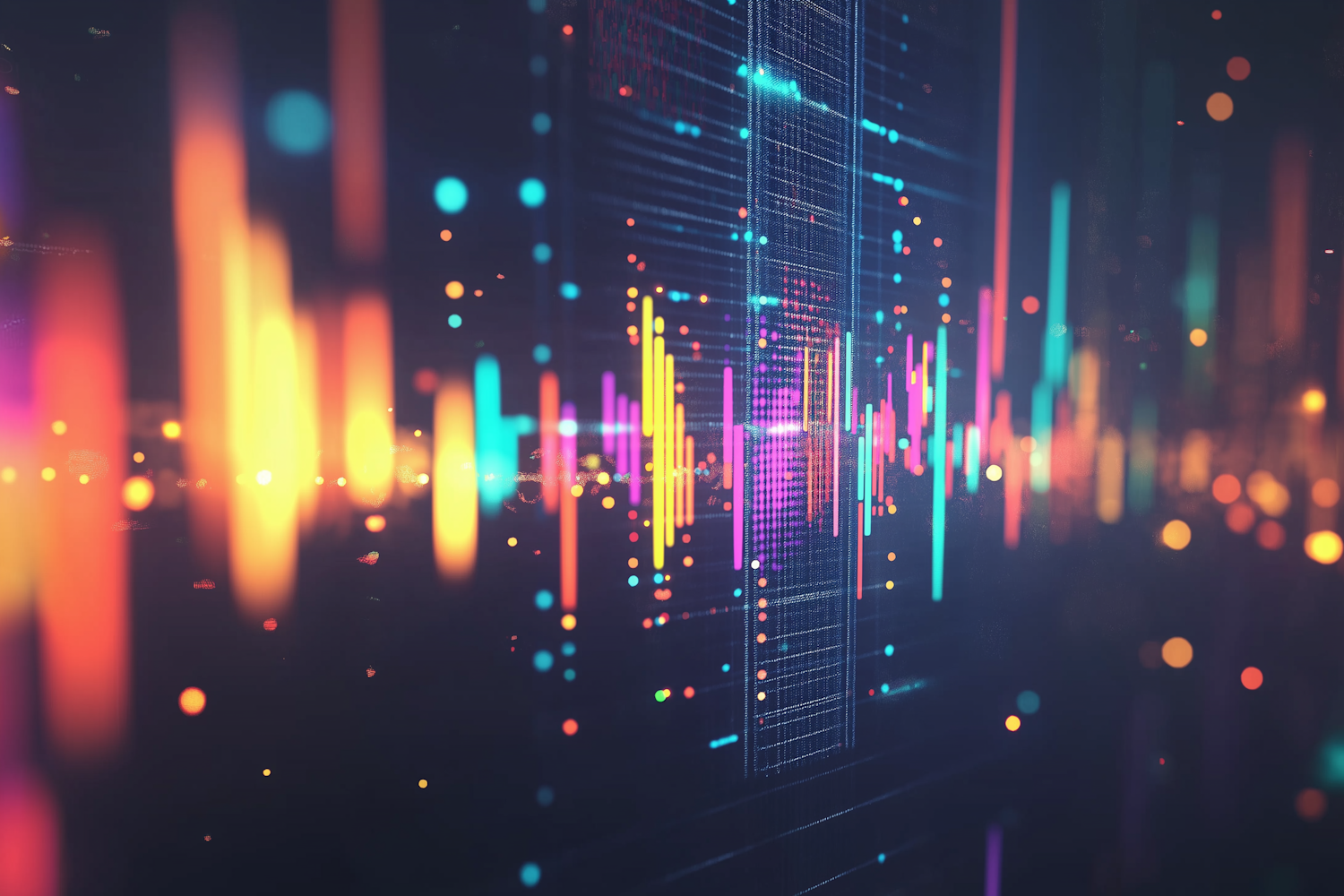 Colorful digital visualization with glowing bars and dots, evoking themes of data, sound waves, and futuristic technology.