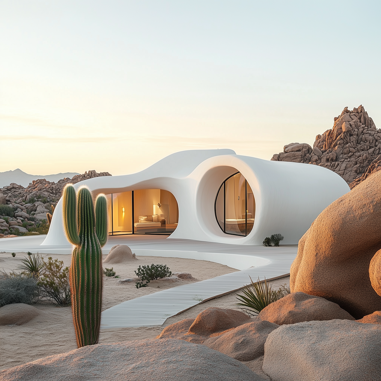 A stunning white, futuristic house with curved design in a desert setting, surrounded by rocks, cacti, and a glowing sunset.