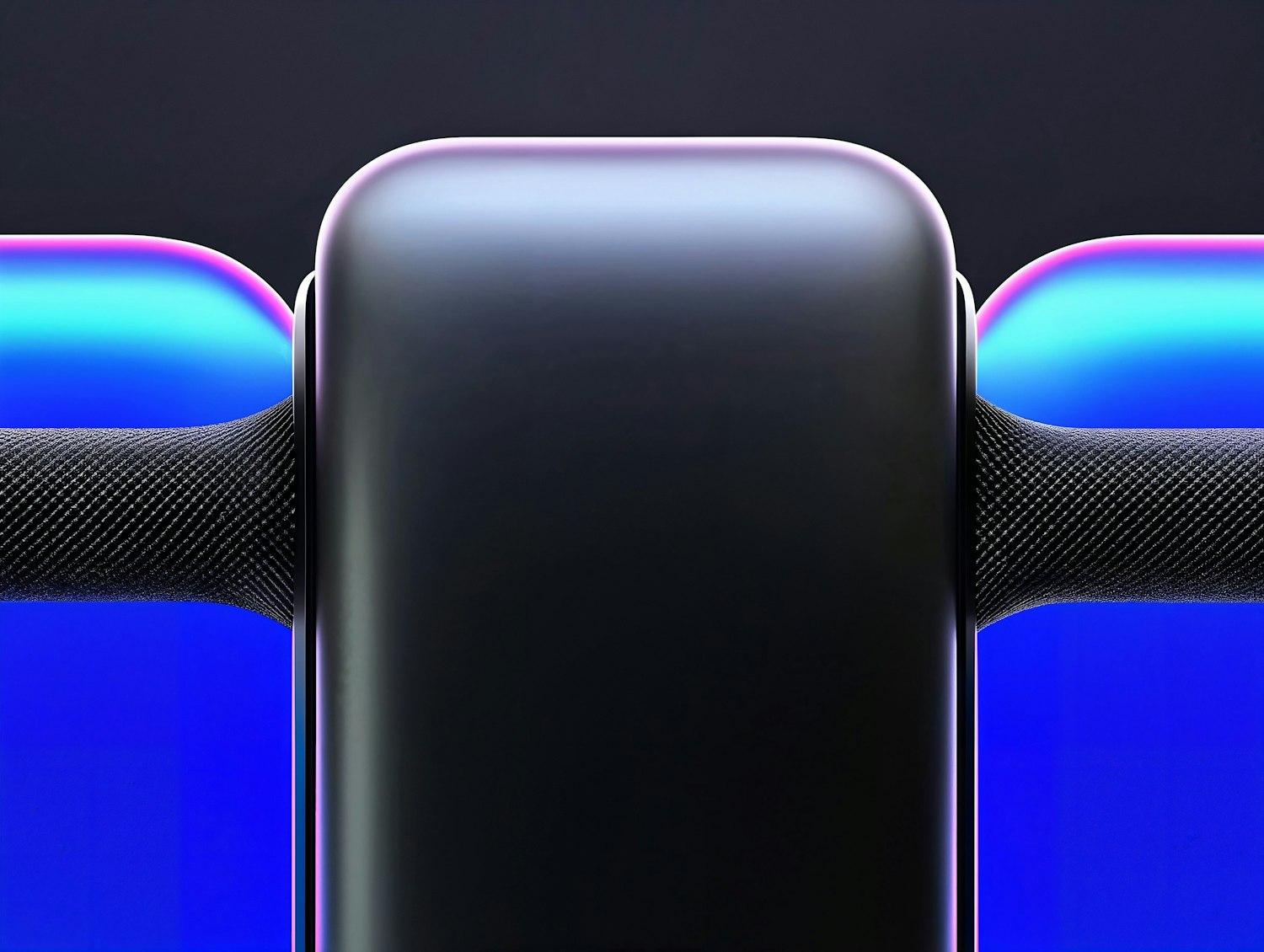 Futuristic design with a glossy black object, iridescent blue panels, and carbon fiber rods, set against a dark gradient background.