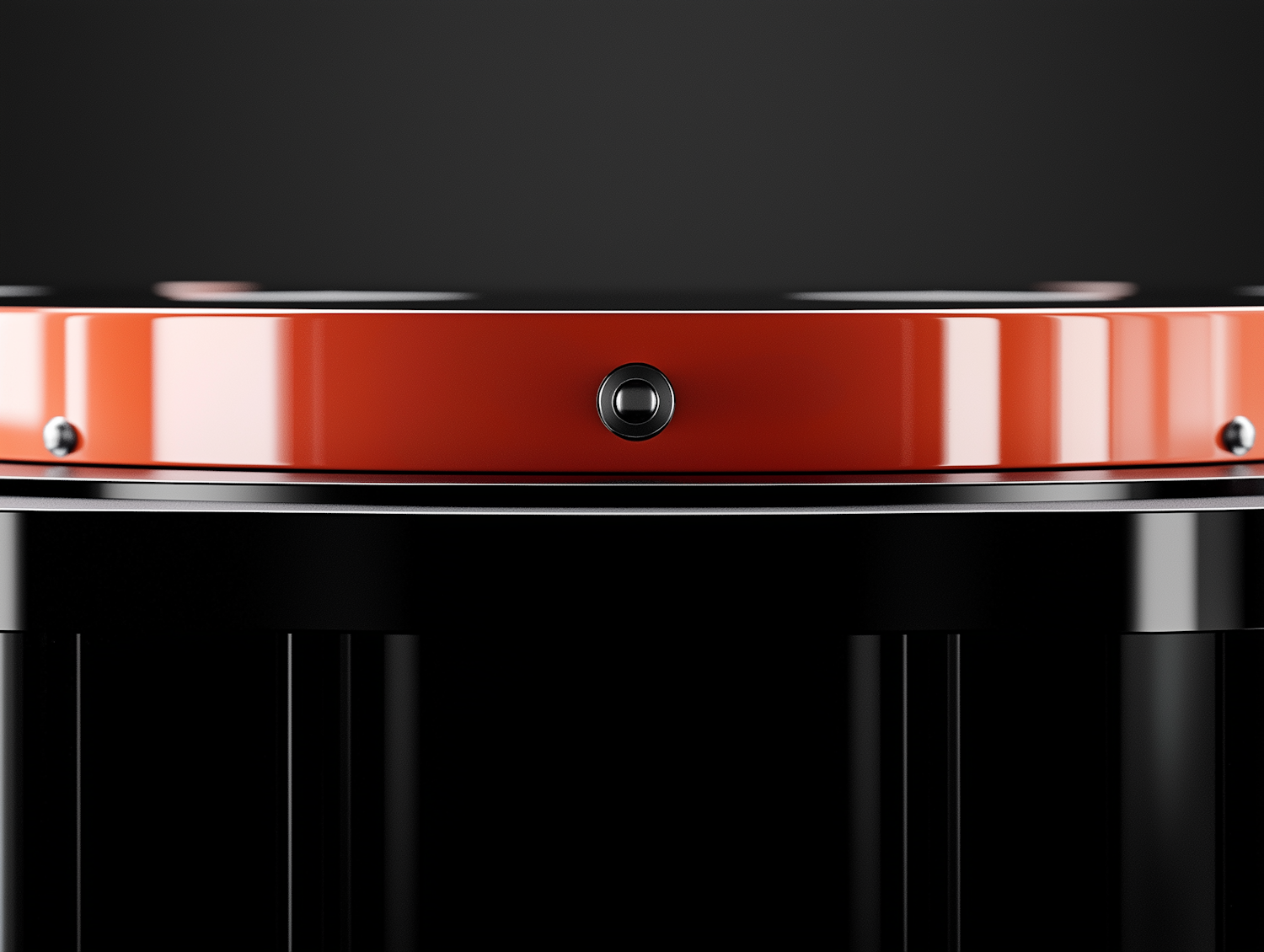 Close-up of a modern cylindrical device with a glossy red top and black base, featuring a lens and metallic accents.