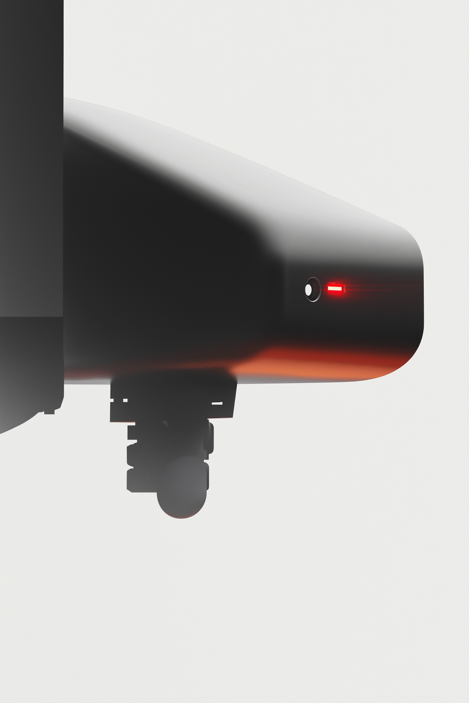 Minimalist black device with a glowing red light and mechanical attachment, set against a clean, light background.