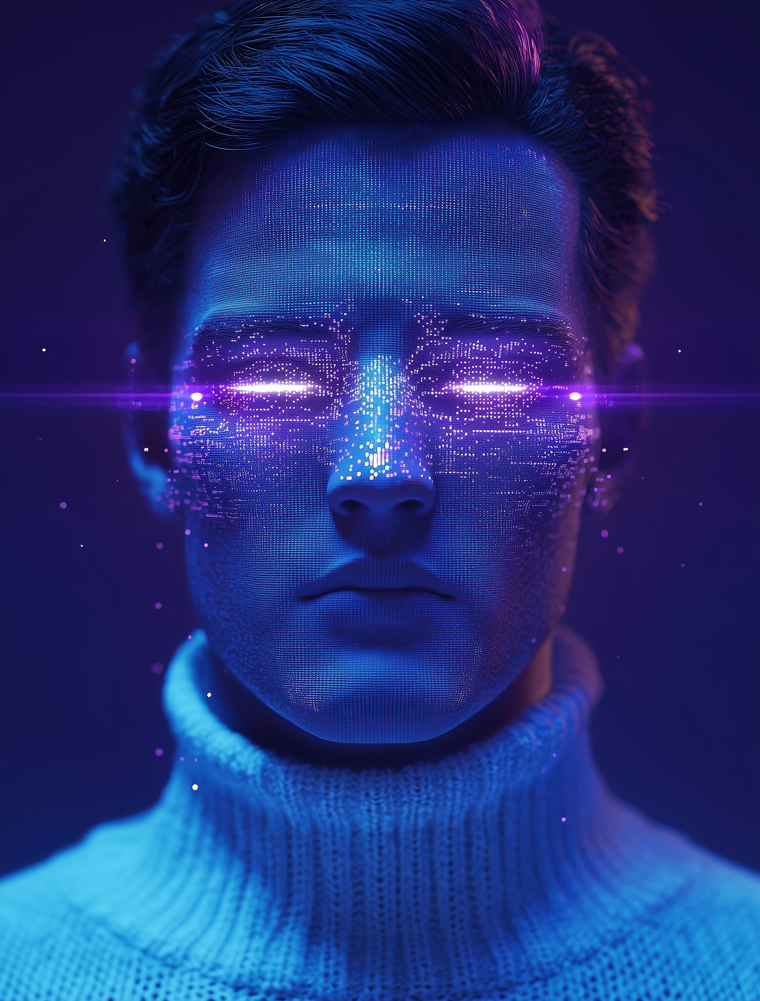 Futuristic digital portrait of a man with glowing, pixelated features and purple neon eyes, set against a deep blue background.