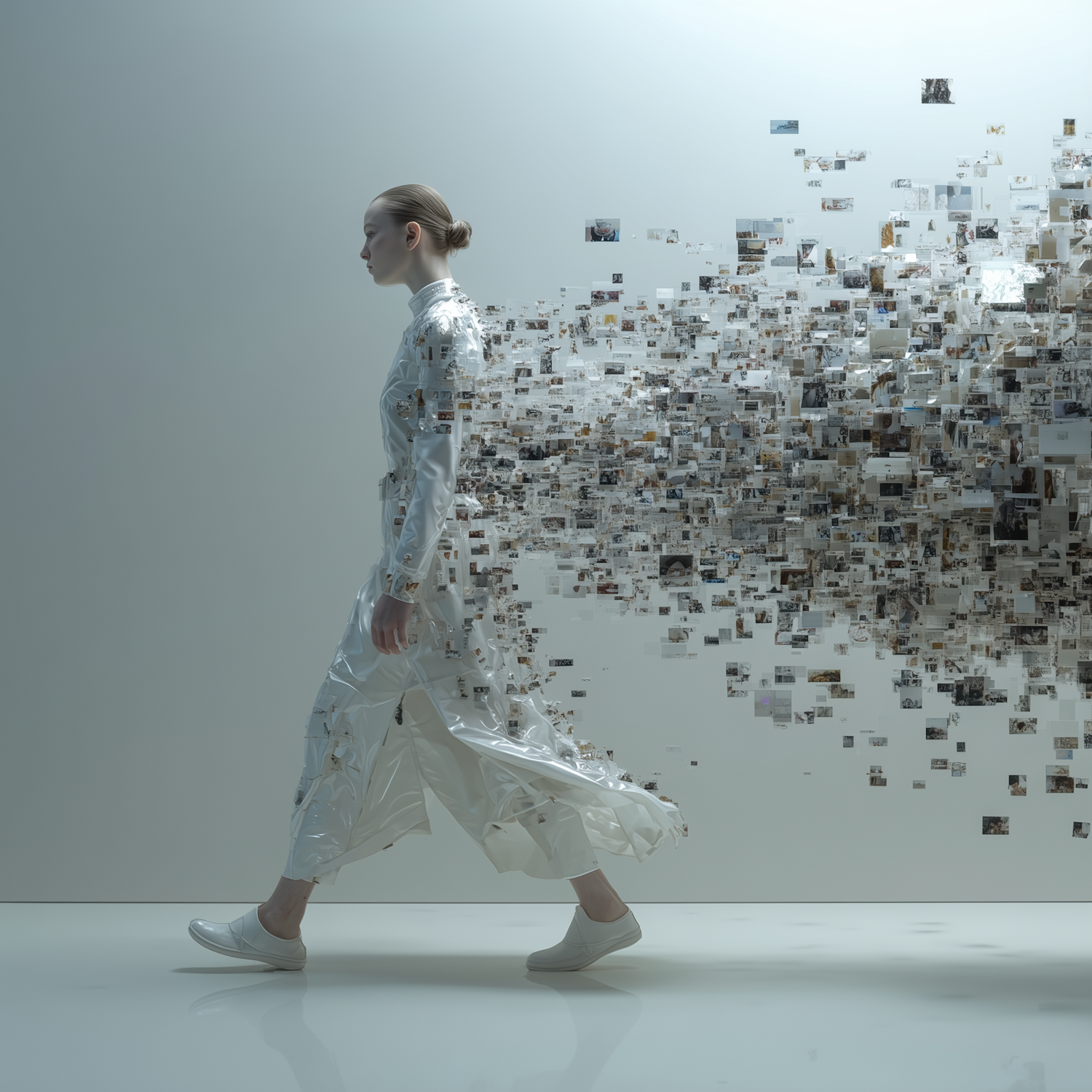 A woman in a futuristic white dress adorned with floating images, walking in a minimalist setting, symbolizing digital transformation.