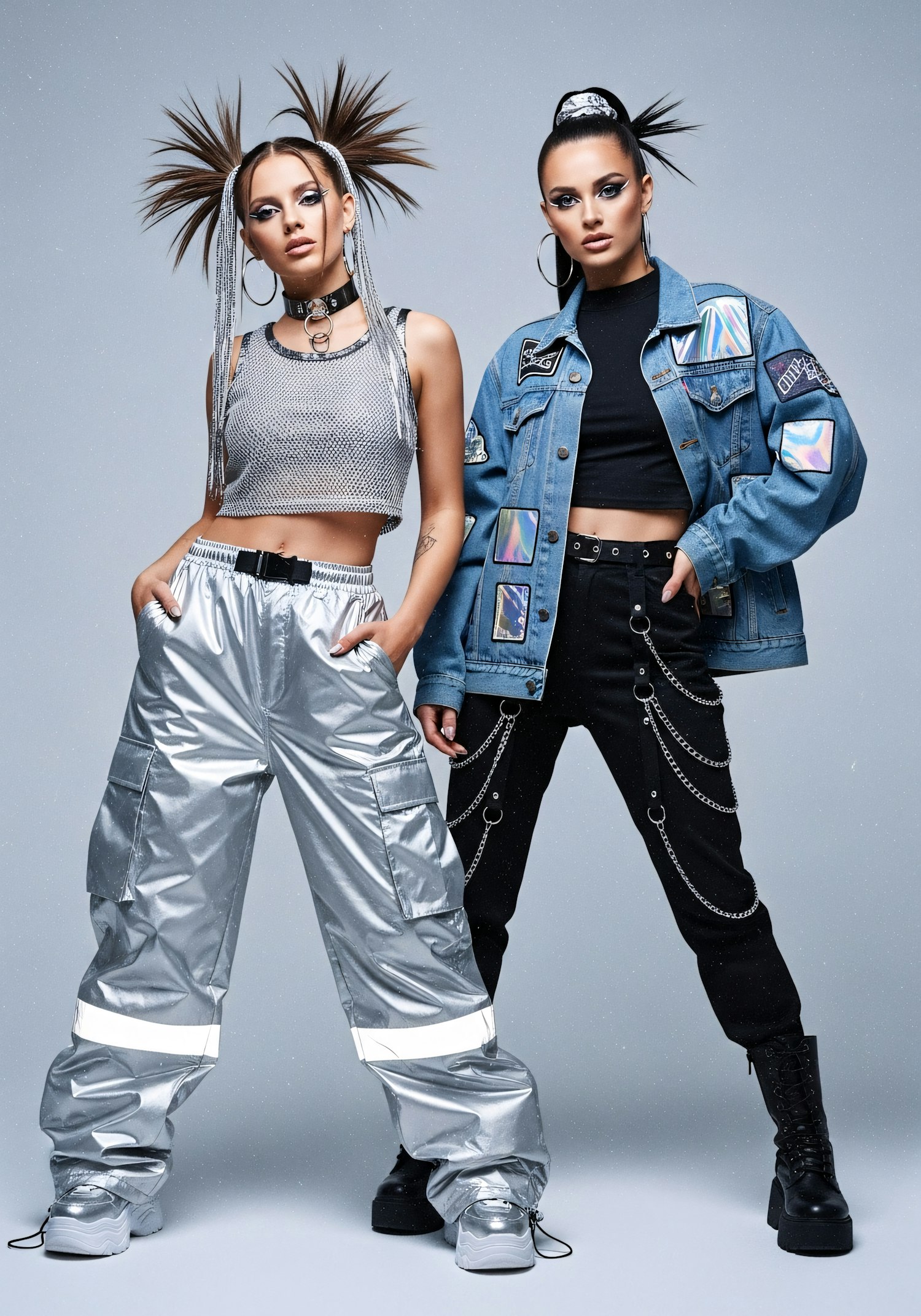 Two stylish individuals in futuristic outfits, featuring metallic and holographic elements, pose confidently in a studio setting.