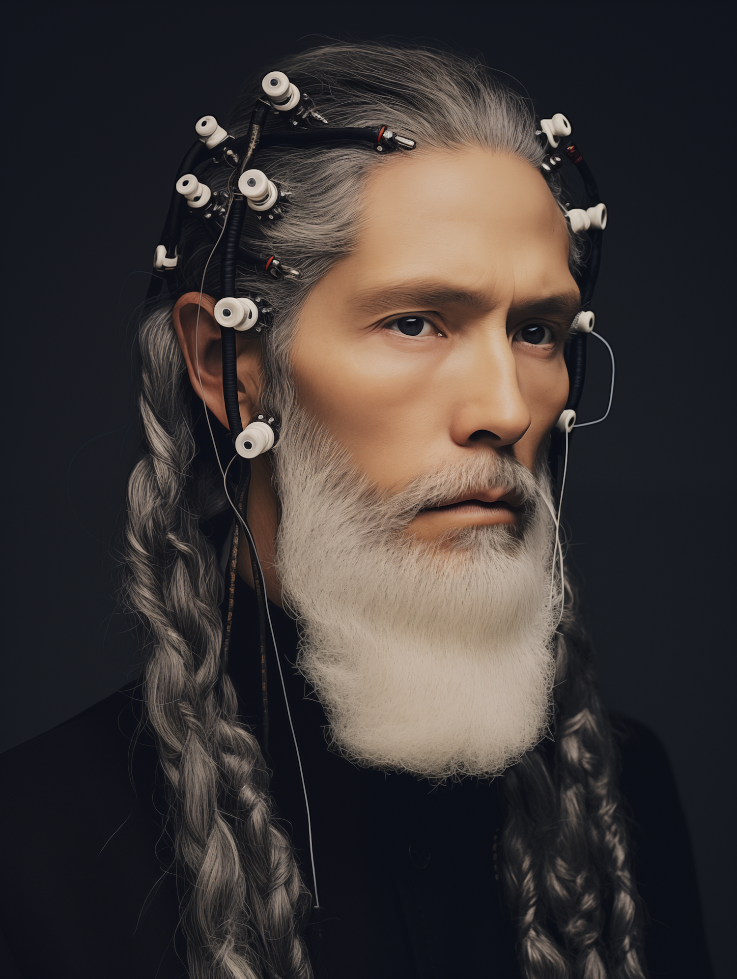Middle-aged Asian man with braided gray hair and white beard, adorned with futuristic electronic devices, against a dark background.
