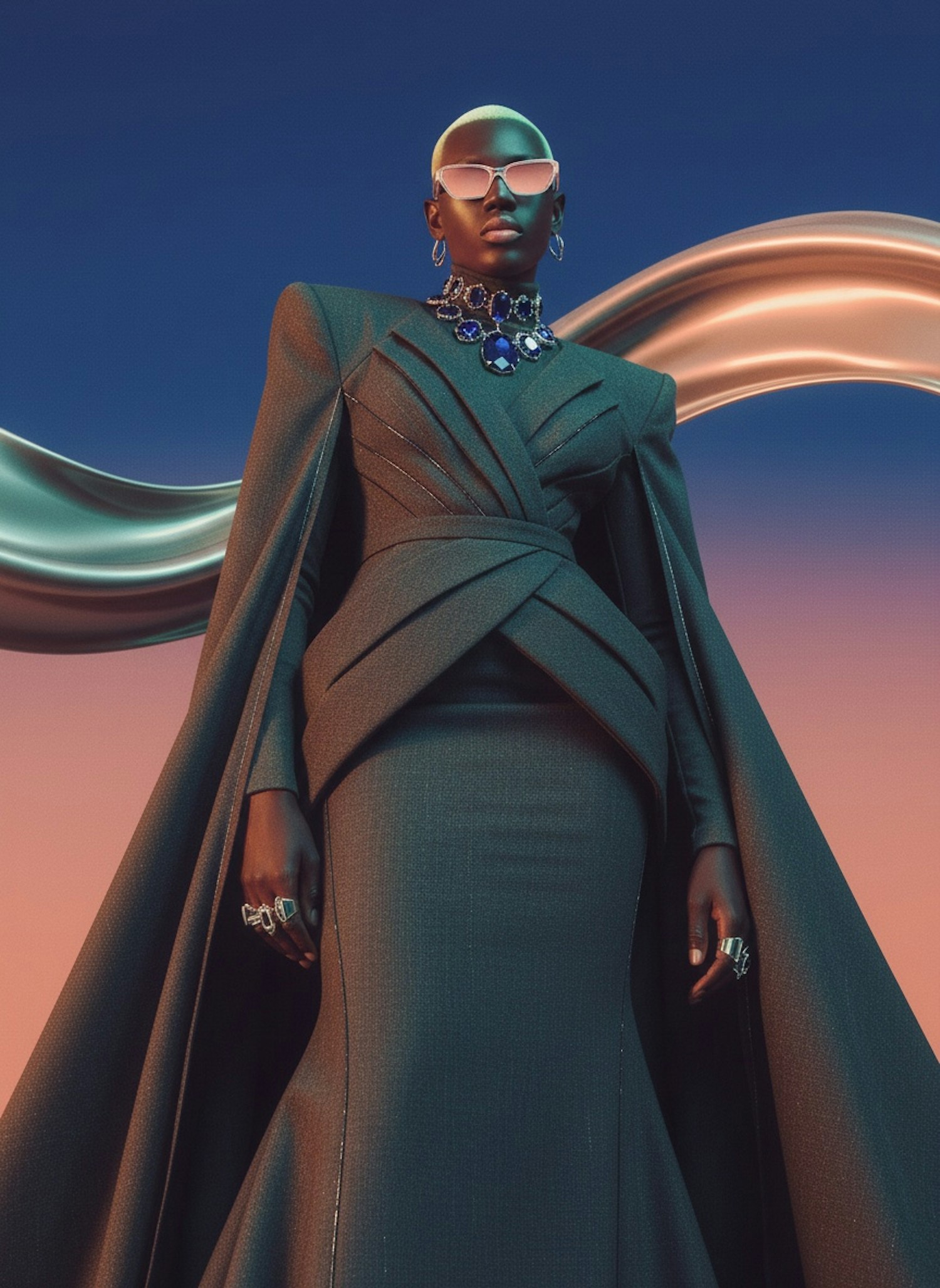 A stylish individual in a dramatic outfit with bold accessories stands against a gradient background, exuding elegance and confidence.